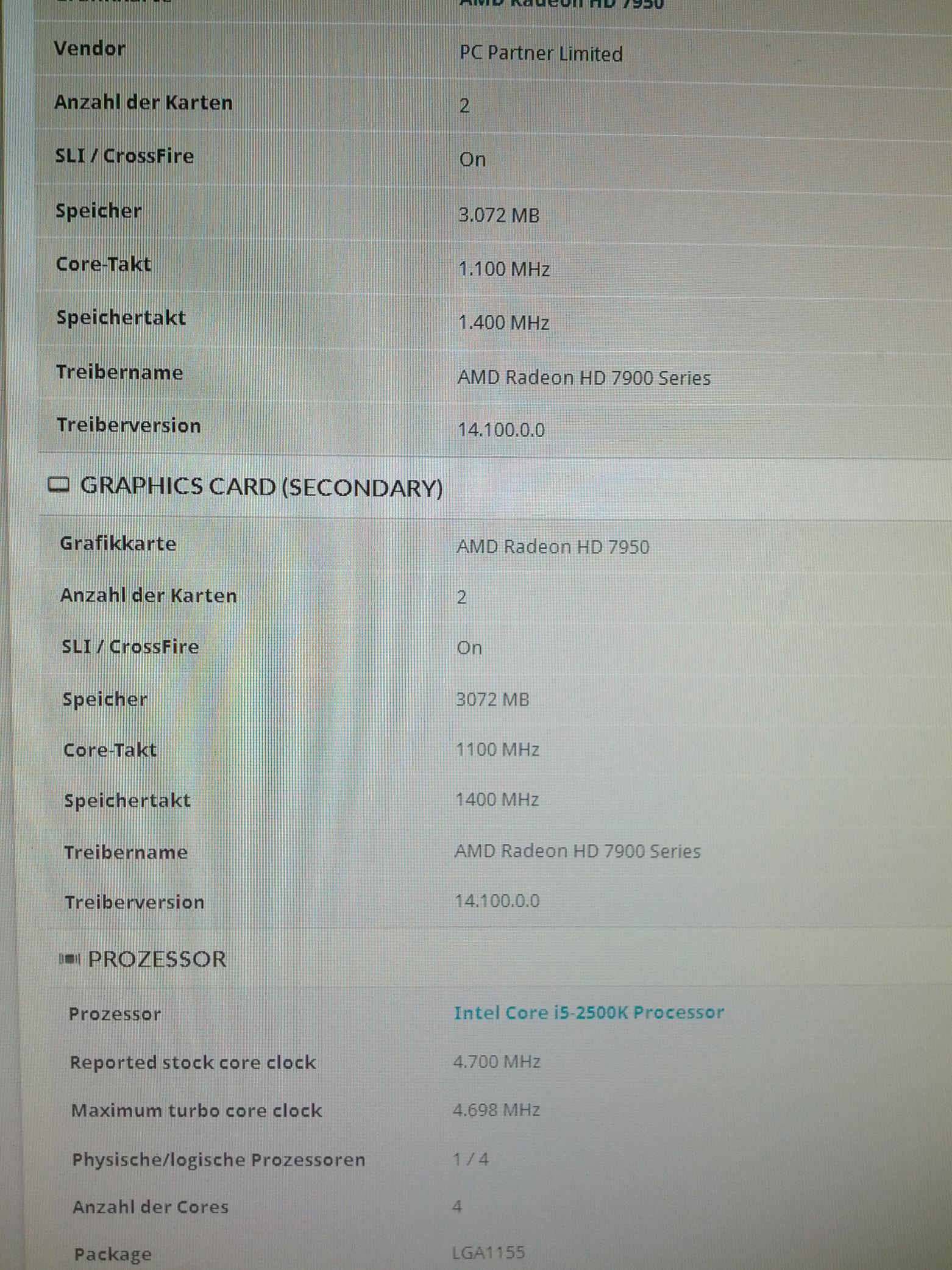 Es handelt sich bei der Master Karte (die neue, gestern gelieferte) um eine Sapphire Hd 7950 vapor X OC schiessmichtot mit Boost Funktion (2 BIOS) Boost Takt 950Mhz