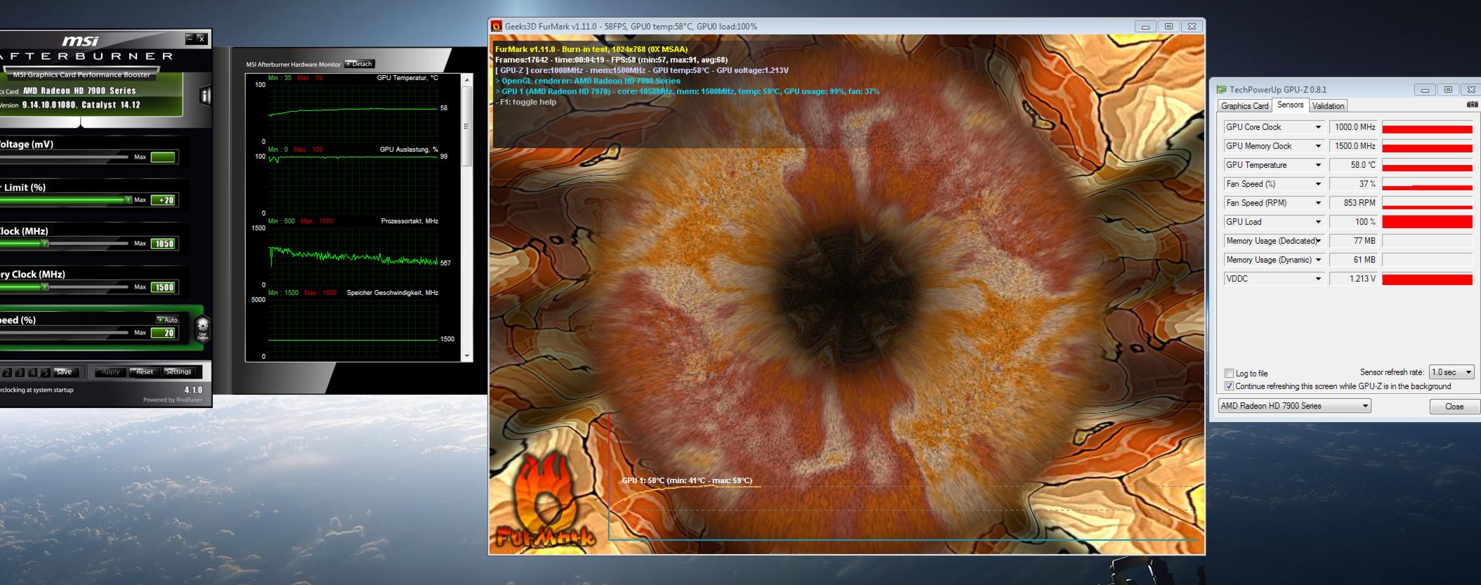 Mit MSI Afterburner und CCC nun von 0 % / 940 /1250 auf +20 % / 1050 / 1500 erhöht.