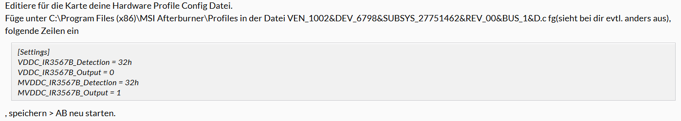 Das Problem an der MSI App ist, dass sie die Spannungen fix setzt und die Graka im Idle die Spannung nicht mehr runter setzt. Deswegen nutze ich den Schrott nicht. Selbst wenn ich die App beende, taktet die Graka nicht in die Idle Spannung zurück, nur ein Neustart hilft. (Keine Ahnung was sich MSI dabei gedacht hat??!! - vermutlich haben die gar net gedacht!)