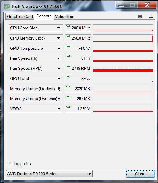 GPU 1200mhz +50mV +0% PT -> Temp nach Abschluss der Loops maximal 74°C bei 81% Lüfterdrezahl. GPU-Z sagt 1,25V, was niemals stimmen kann, basierend auf den ermittelten Temperaturen.