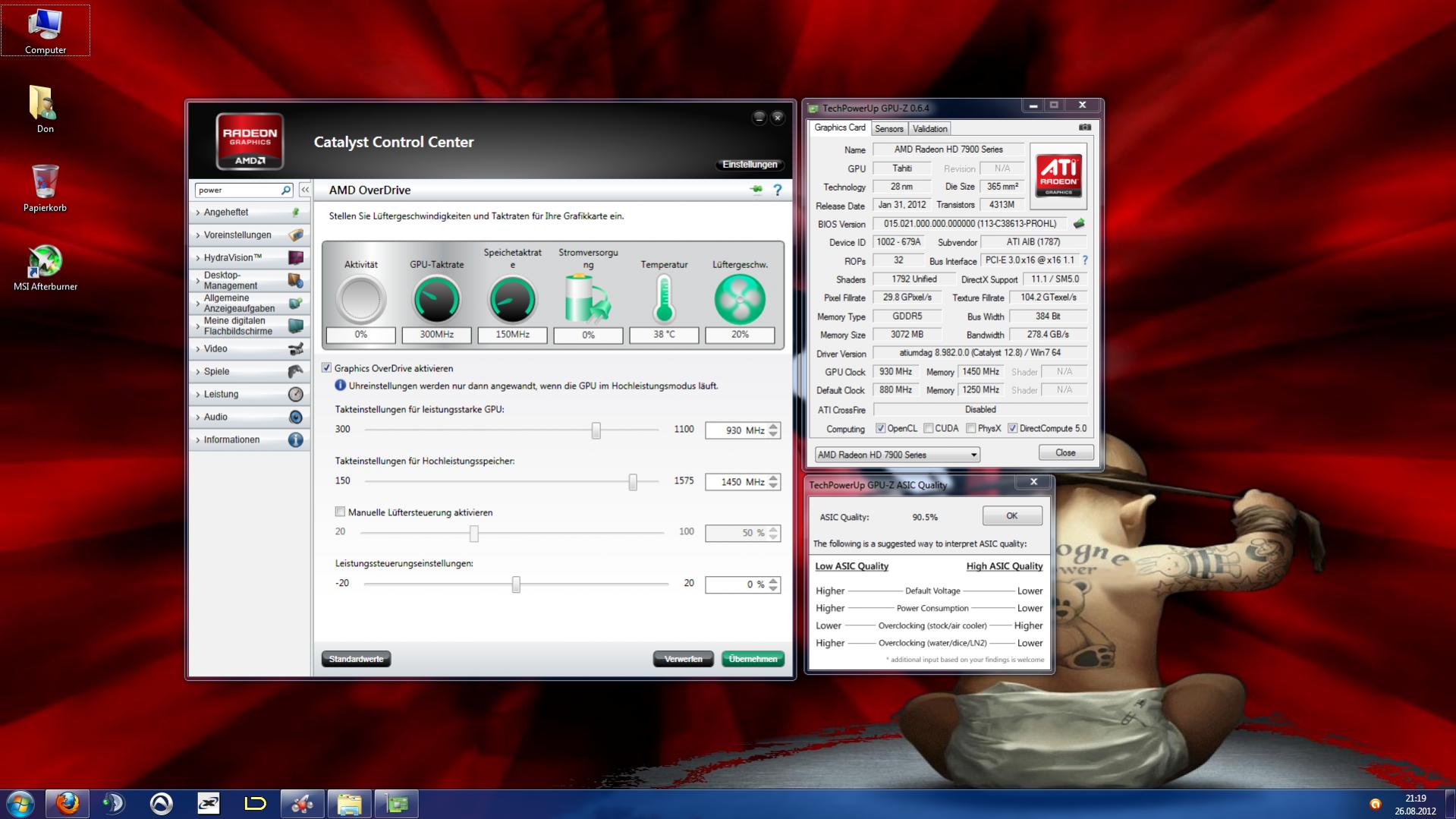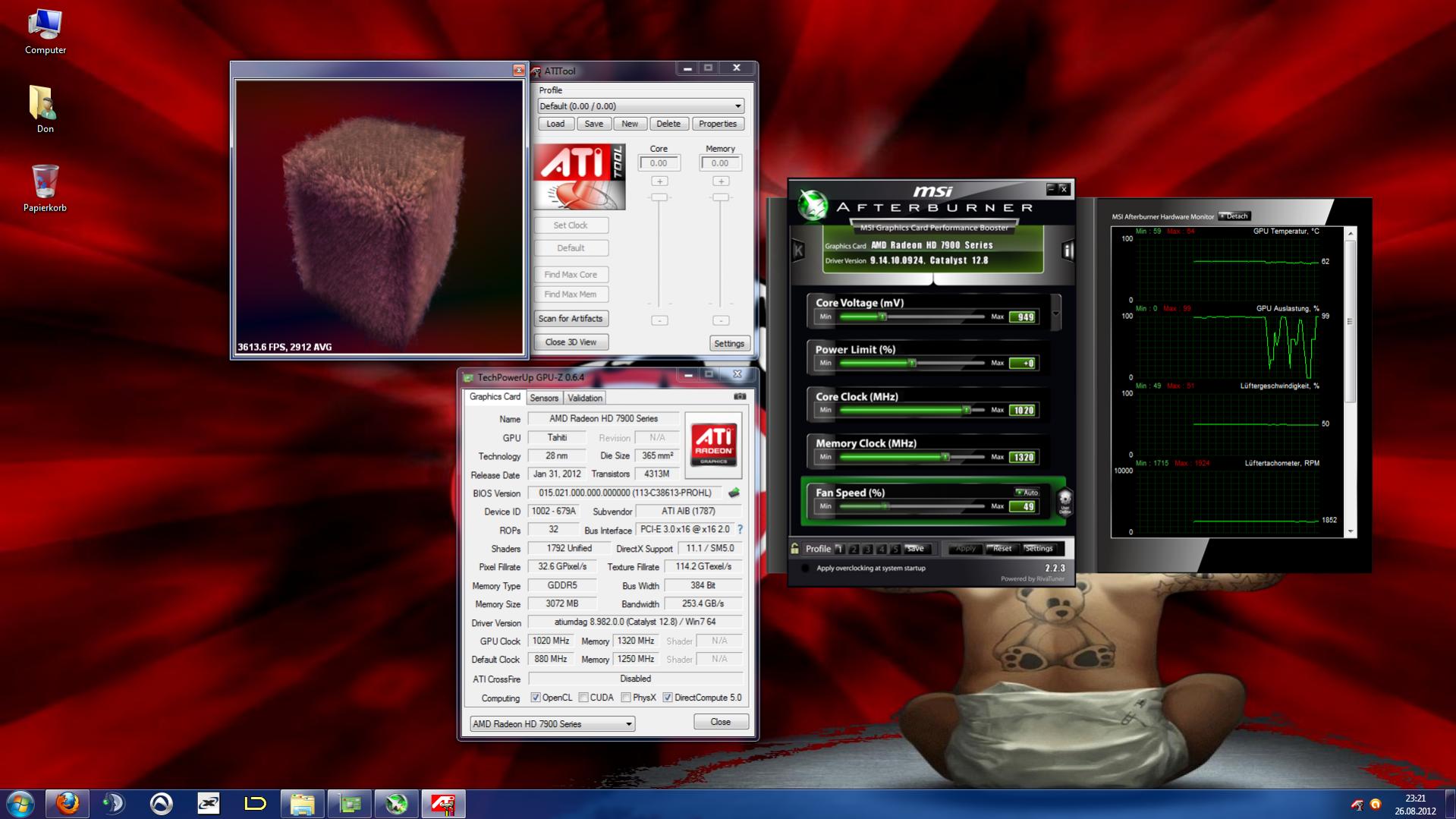 Allerdings sind 1100 MHz stabil bei ursprünglichen 800 MHz auch 'ne ziemliche Hausnummer. In Verbindung mit höherem Speichertakt sind da je nach Spiel sicherlich 25% Mehrleistung drin, was die 7950 damit ziemlich stark Richtung 680 schiebt, wenigstens auf das Niveau einer 670. Und eine 7970 mit 1100 MHz dürfte auch an so ziemlich jede 680 auf dem Markt rankommen. Durch die TDP-Limitierung sind deren OC-Ergebnisse ja vergleichsweise dünn...
