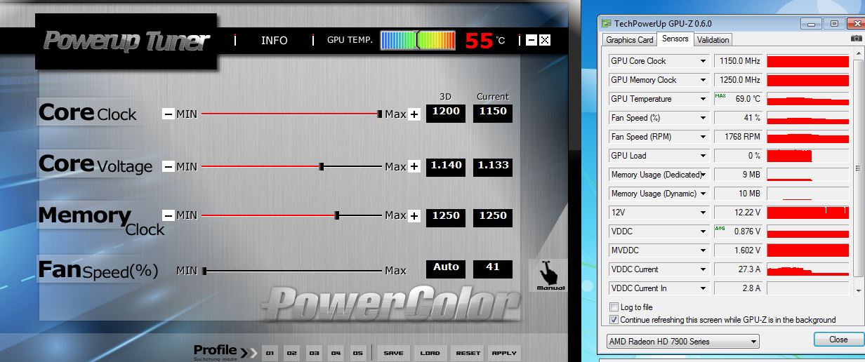 Da ich an meinen Spannungen eh nichts drehen kann hab ich einfach mittels CCC auf 1100 MHz übertaktet und das Powertarget vorsorglich auf +20 % gesetzt. Mehr nicht. Für mehr als 1125 müsst ich dann irgendwo die Spannung hochstellen, aber das klappt bei meiner Karte ja leider nicht.