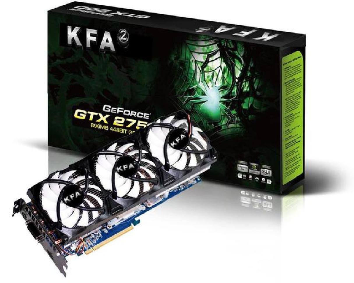 Die KFA² GeForce GTX 275 OC setzt völlig neue Maßstäbe in Punkte Kühlung und Übertaktbarkeit. Die KFA² setzt auf einen Arctic Cooling Accelero Xtreme Kühler und auf zahlreiche Überarbeitungen. Nicht nur die digitale Stromversorgung und die betreffenden Teile wurden überarbeitet, welche jetzt eine Effizienz von mehr als 80 Prozent erreichen sollen. Ein Dual-BIOS soll das sichere Übertakten der Karte mit einer mitgelieferten Software erlauben. Als Referenztakt arbeitet die Karte aber bereits mit leicht erhöhten 650 MHz Chip-, 1.475 MHz Shader- und 1.200 MHz Speichertakt. Der beim Referenzmodell wegrationalisierte S-Video-Ausgang ist beim Modell von Galaxy wieder mit von der Partie, neben dem DVI-Ausgang steht zudem ein nativer HDMI-Port bereit.