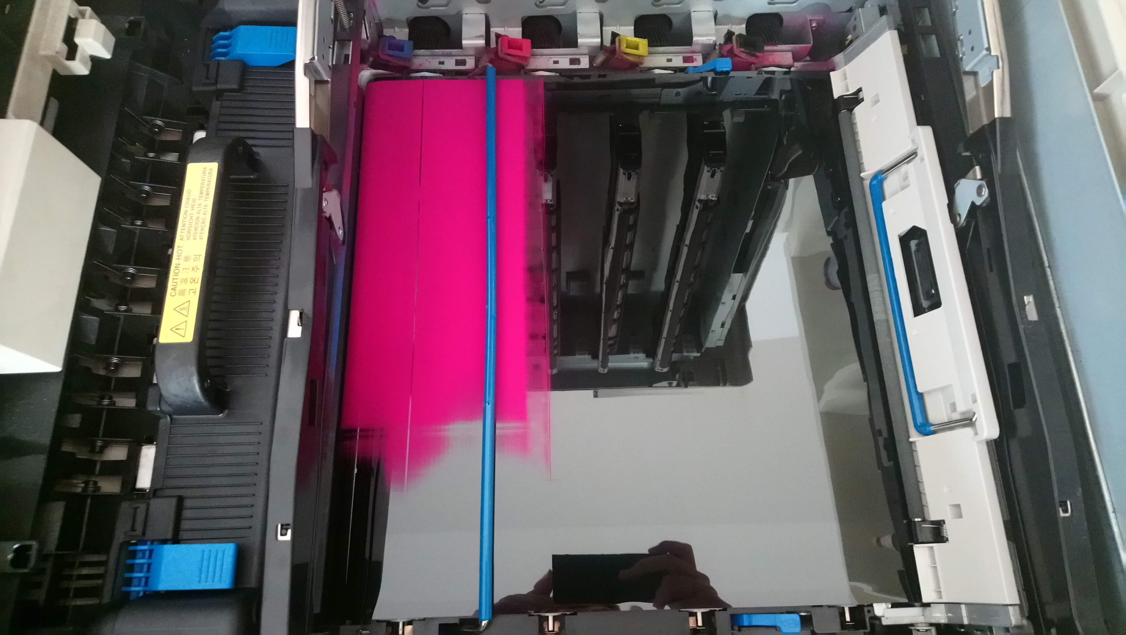 Servus, unser Laserdrucker im Büro (OKI 9650) druckt seit Tagen nur noch sporadisch, aktuell geht leider gar nichts mehr. Es kommen nur noch magenta oder schwarz farbene Ausdrucke, die dann langsam streifig auslaufen... Wir hatten auch schon einseitig dunkelgrüne Seiten, oder mal bunte Mischungen... Getauscht haben wir gefühlt alle Komponenten, weiß jemand von euch was sowas verursachen könnte? Siehe Foto mit 2 Ausdrucken... Bin hier ziemlich ratlos.