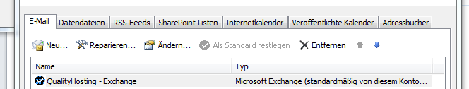 ich musste meinen Exchange Anbieter wechseln und habe in Outlook 2010 neben meinem alten Standard-Exchange Konto sowie 2 POp3 Konten das neue Exchange Konto angelegt und alles Einstellungen, Kontakte und Kalendereinträge aus dem alten Konto ins neue verschoben und möchte nun das alte Konto löschen. Das neue Konto habe ich unter Kontoeinstellungen sowohl bei "E-Mail" als auch bei "Datendatei" als Standard-Konto definiert.