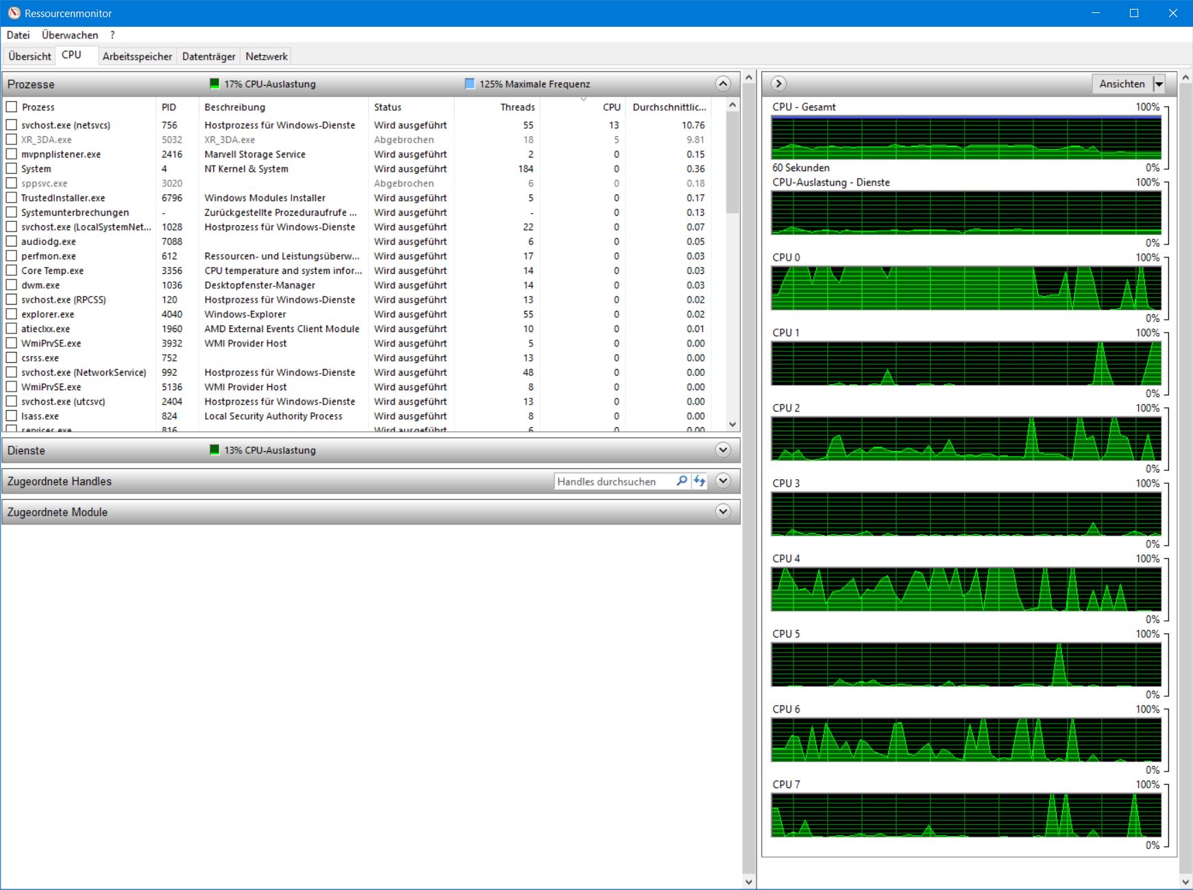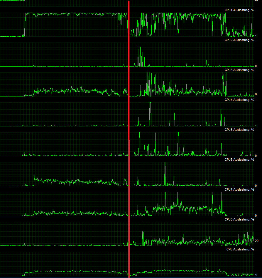 linke Seite : original Spielprogrammierung; man sieht - nur Kern 1 wird belastet, ständig bis zu 100%