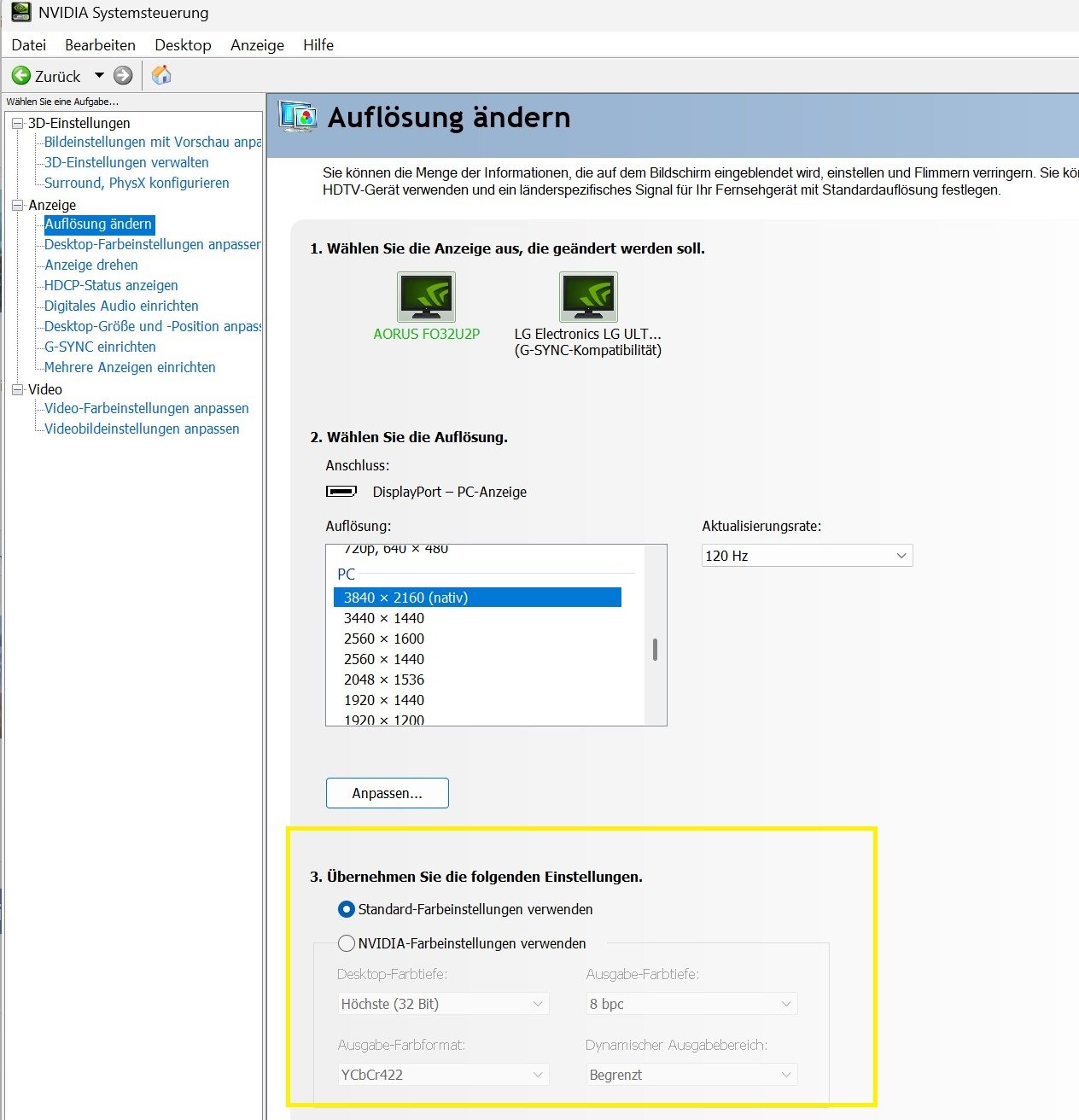 Wenn ich dort auf 10 bit umstelle, ohne vorher in den Windows-Einstellungen auf HDR zu wechseln, wird der ganze Bildschirm rosa mit streifen.