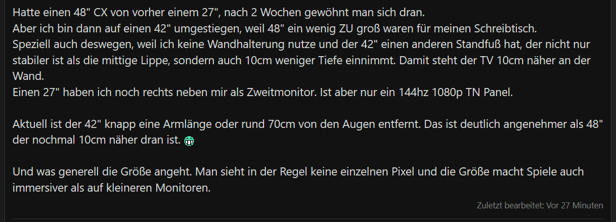 Aktuell ist der 42" knapp eine Armlänge oder rund 70cm von den Augen entfernt. Das ist deutlich angenehmer als 48" der nochmal 10cm näher dran ist.