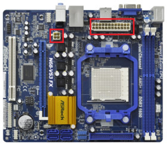 Der Rechner selbst läuft aber, also hat Strom? Oder drehen nur die Lüfter? Stromkabel korrekt angeschlossen? Da müsste so ein dicker 24-PIN sein und 1-2 kleinere nahe der CPU. Wenn ich mir Google Bilder ansehe, dann hast du 1x 4PIN mittig auf dem Board, das Netzteil scheint aber gar keine 4-PIN Stromanschlüsse zu haben?
