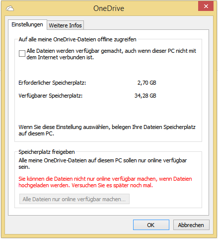 Bei mir kommt dann das Fenster von dem meinem Screenshot. Und in dieser PC-Optionen App kann man nicht wirklich irgendwas einstellen sondern nur verwalten was alles Hochgeladen werden soll.