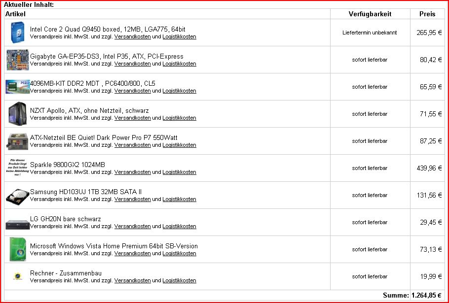 - GraKa würden zwei 8800 GTS reichen. Die sind fast genau so gut wie die 9800-Reihe und für einen 19-Zöller besser geeignet als ein GTX-Modell (oder doch nicht?)