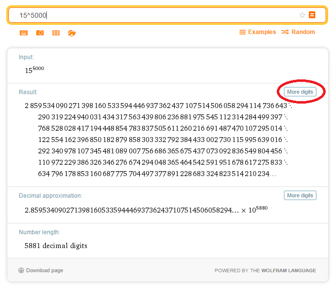 Ich würde da "bignumber calculator" in Google eingeben und dann Dinge wie https://defuse.ca/big-number-calculator.htm finden. Ob es wirklich 5000 Stellen sind, musst du selber rausfinden...