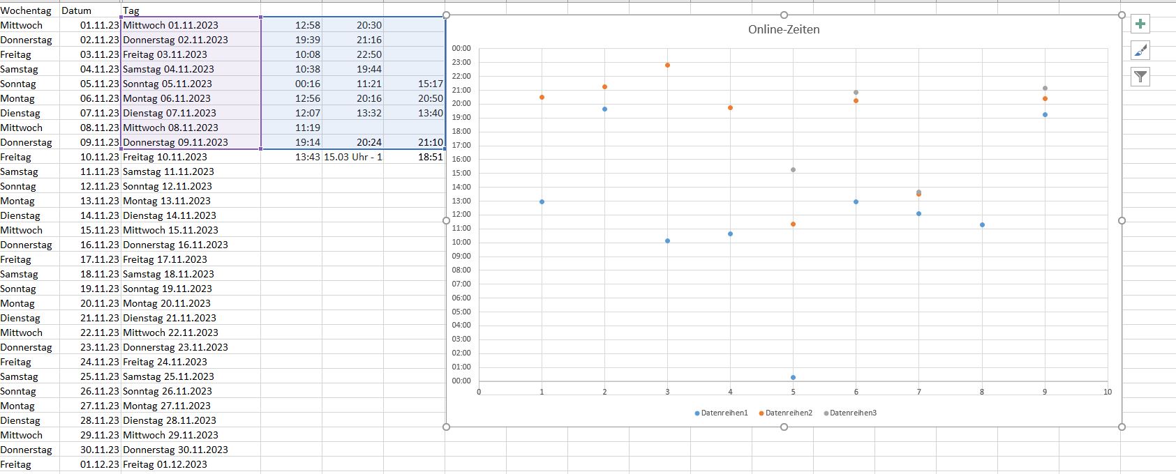 Ich habe schon probiert und gemacht und dabei das herausbekommen. Ich brauche im Grunde aber keine verschiedenen Datenreihen, die Punkte können alle ein und dieselbe Farbe haben. Wenn es an einem Tag ganz viele Online-Zeiten waren, würden ja auch ganz viele Datenreihen entstehen?!