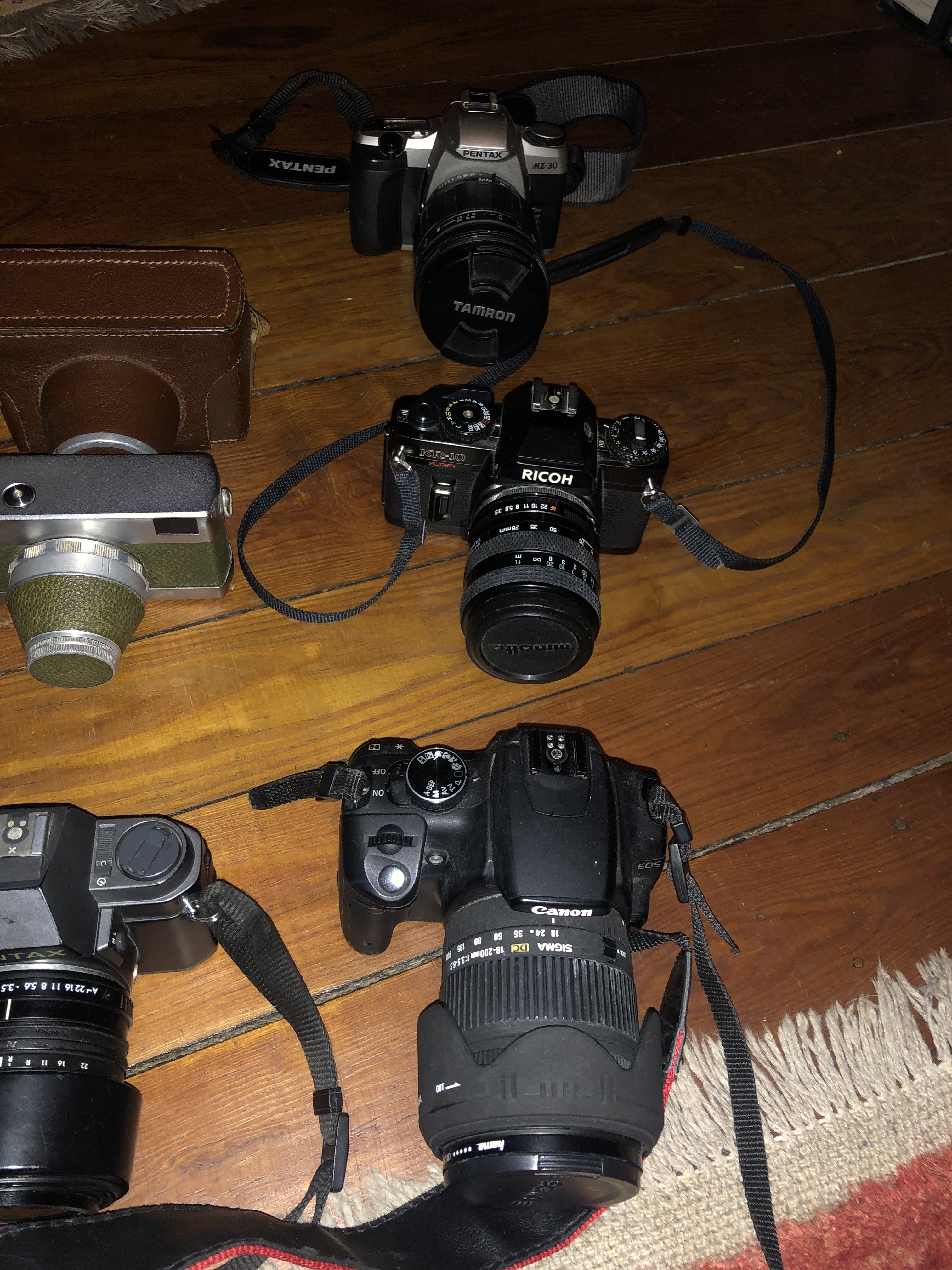 Erstes Bild links ist eine Praktica. Vielleicht eine MTL-5. Das Objektiv sieht aus wie ein Meyer Optik Domiplan.
