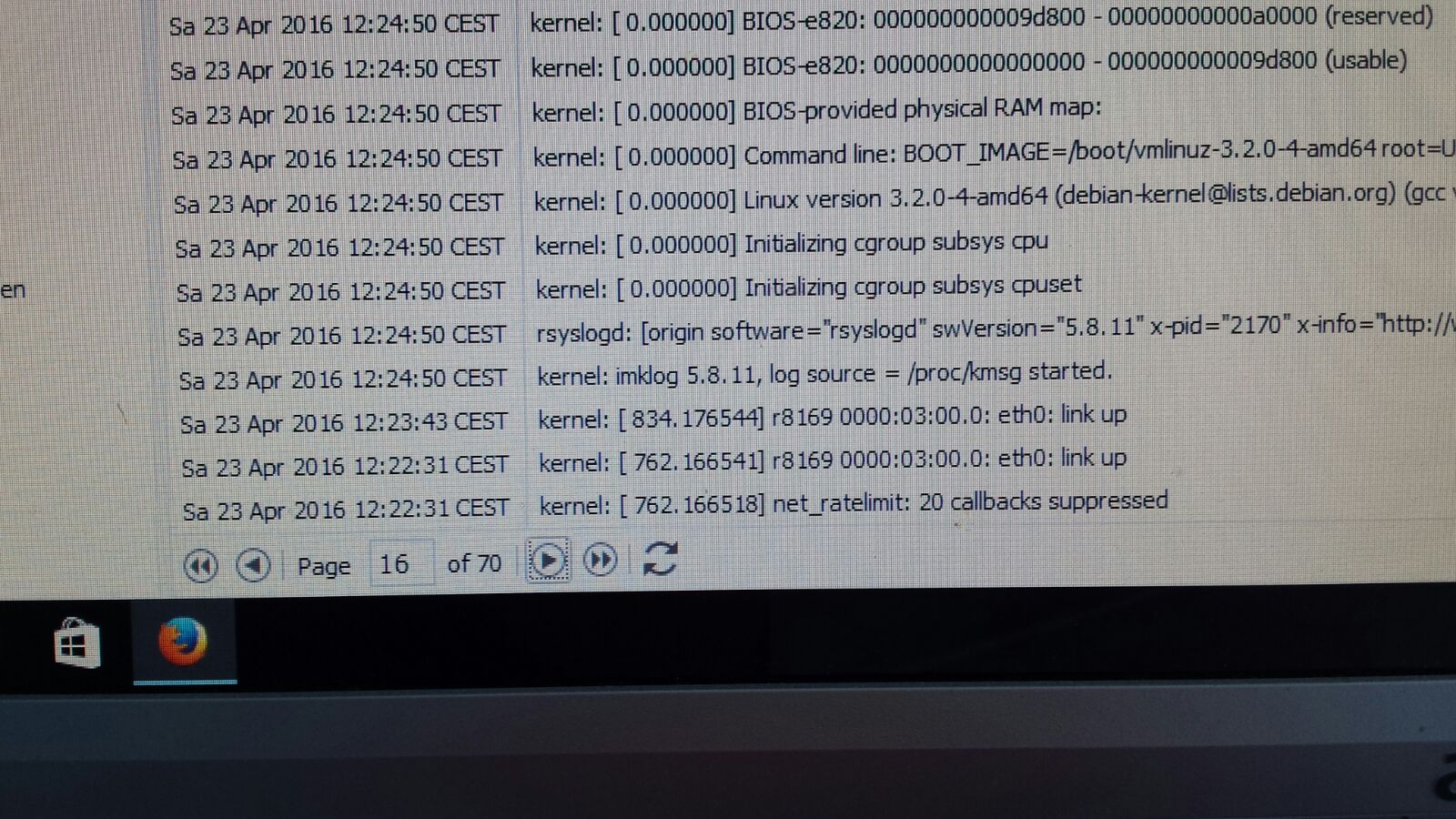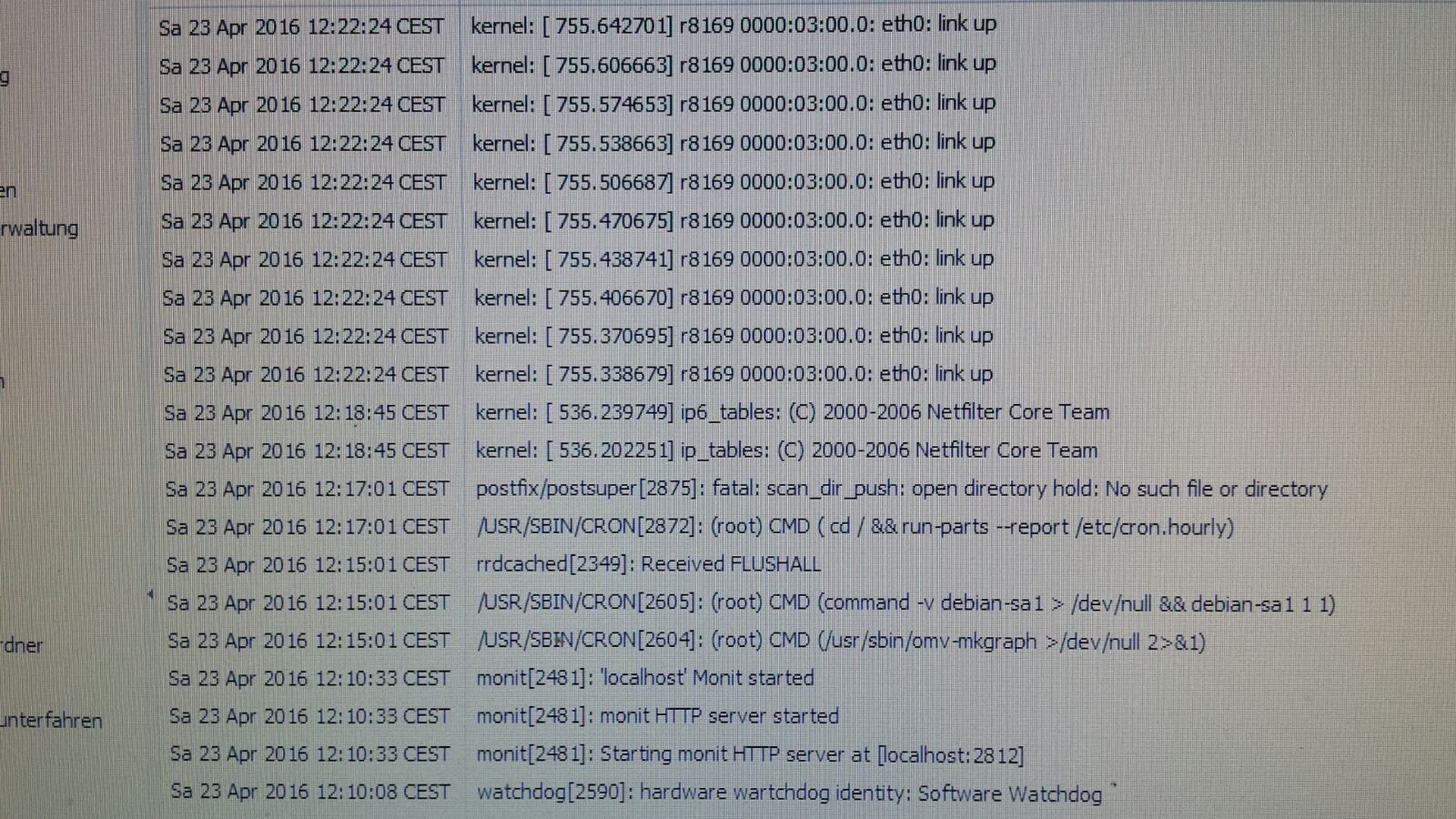 Apr 23 12:33:09 NAS kernel: imklog 5.8.11, log source = /proc/kmsg started.