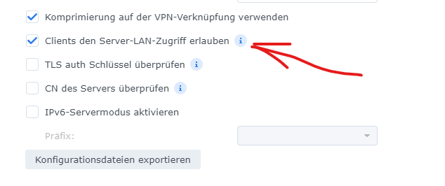 Leider hast du keine Informationen darüber mitgeteilt, welche IP-Adresse dein Synology-NAS hat und welches das Ziel-Netzwerk ist. Da kann man jetzt nur ins Blaue schießen bzw. einfach mal blind ein Beispiel machen für den Fall, dass dein Synology-NAS im gleichen Subnetz ist wie die Ressourcen bzw. Geräte, auf die du über den VPN-Tunnel zugreifen möchtest.
