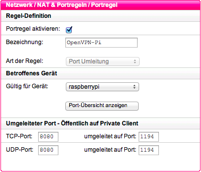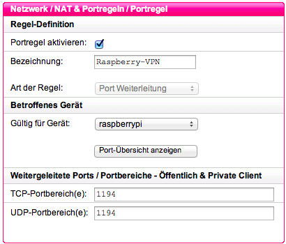 Im 723v router hab ich ne portregel definiert, mit dem namen Raspberry und dort "weiterleitung" auf die Raspberry IP/Hostname (PC192-168-2-104) und im Feld TCP-Ports den Port 22 freigeschaltet (per remoteverbindung innerhalb des netzwerks kann ich per IP 192.168.2.104 und per Port 22 zugreifen auf den raspberry) und den port 1194, weil er im OpenVPN-Server in eine KEY-Datei für die client eingetragen ist (war so und per VPNclient bekomm ich ja auch ne connection).