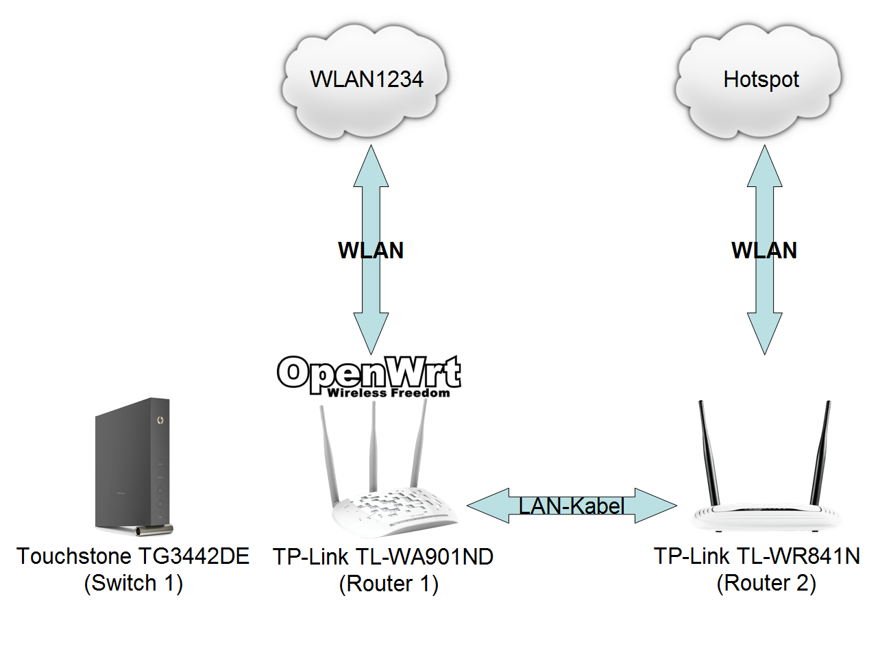 an erster stelle möchte ich mich für meine Rechtschreibeung entschuldigen. Vielleicht könnt ihr mir helfen. Ich wollte mir ein Heimnetzwerk aufbauen mit 3 Routern... einmal einen TPLink WA901nd (nennen wir ihn Router1), einem TP WR841n (nennen wir ihn Router2) und zuletzt eine Vodafone Station DOCSIS3.1 die ich eigentlich nur als "Switch" benutze (nennen wir ihn SW1). Keiner dieser Geräte ist irgendwie mit DSL oder Cable mit dem Internet verbunden. Nun meine Frage: auf dem Router 1 habe ich OpenWRT installiert und möchte mich als Client bei einem Wlan netz einloggen (Nennen wir es mal WLAN1234). Anschließend über den Lan Port (von Router1) an den Router2 anschließen sodass der Router2 ein Internet zugang hat und dann auch über Router2 ein Hotspot einrichten. Der Router2 sendet das Lan signal in Wlan aus mit seiner eigenen SSID sodass sich CLients damit verbinden können. Nun das schwierige... . Der Zugang zum Haupt-router (WLAN1234) hat eine Mac-adress-filter mit der freigabe für Router1. Nun das aller schwierigste... . Ich habe bei Router1 DHCP deaktiviert und habe ihn versucht mich mit dem Hauptrouter zuverbinden aber der will ums Erbrechen keine Ip beziehen.