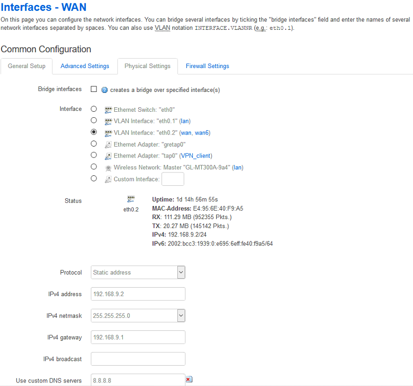 WAN IP: 192.168.9.2 statisch <-- Hier verbindung zum Router 192.168.9.1