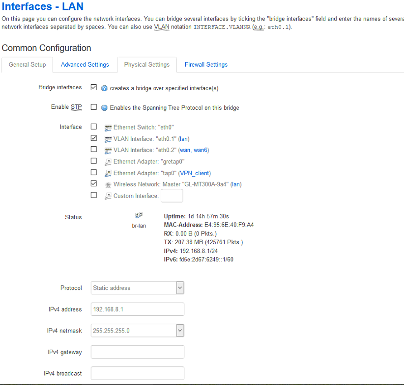 LAN IP: 192.168.8.1, DHCP an (Standardeinstellung, da bin ich flexibel, da dieses Netz nicht genutzt werden wird, derzeit aber hilfreich wenn der WAN Adapter beim probieren zerschossen ist)