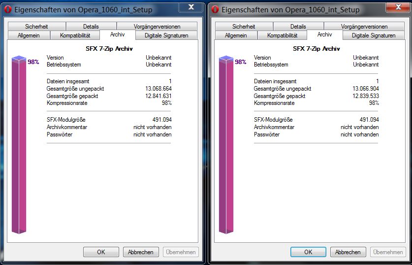 Problem gelöst.Habe Opera nochmal von der Platte gekickt und neuinstalliert.Habe aber jetzt Opera hier von CB geladen.Ich habe mir mal die Setups genauer angeschaut.Mir ist aufgefallen(wie auch auf dem Bild zu sehen),dass es da kleine Unterschiede gibt.Links auf dem Bild Opera von CB geladen,rechts auf dem Bild von Opera.com.Könnte das der Grund für mein Problem gewesen sein?Müssen die Setups allle gleich gross sein,egal woher man sie lädt?