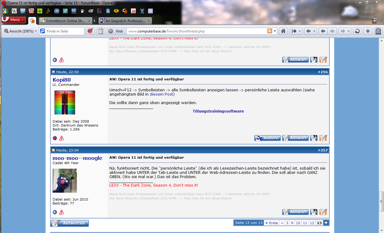 Habe mal den Thread ausgegraben, weil ich dafür kein extra-Thema aufmachen will. Opera wurde bei mir nun automatisch geupdatet auf 11.0. Das Problem ist nun, dass die Lesezeichen-Leiste nicht mehr da ist, wo sie mal war. Bisher hatte ich ganz oben die Lesezeichen, darunter die Tab-Leiste und darunter die Navigationsleiste mit dem Eingabefeld. So. Nach dem Update ist ganz oben die Tab-Leiste, darunter die Navigationsleiste und darunter die Lesezeichen-Leiste. Dort stört die aber. Der Text der Lesezeichen kommt mir mit dem Text der Webseiten in die Quere und zu navigieren ist so auch schwieriger geworden, weil die Vor- und Zurück-Buttons nicht mehr direkt über der Seite sind, sondern über der Lesezeichen-Leiste. Wie kriege ich die denn nun wieder ganz nach oben? Dahin, wo sie hingehört. Das ist doch Murks! Wer hat denn solche bekloppten Einfälle? Mann, mann, mann. Sowas fällt für mich schon fast in die Kategorie "ein Grund, den Browser zu wechseln". So, aber mal wieder zurück zum Thema: Mir wäre es ganz lieb, wenn mir hier jetzt einer einen Tipp geben könnte, wie ich das wieder hinbekomme. Irgendjemand einen Einfall? Meine Versuche haben bis jetzt nicht gefruchtet, weil bei den Optionen nur eingestellt werden kann, ob man die jeweilige Leiste oben, links, rechts oder sonstwo haben will. Zwischen oben, ganz oben und noch dadrüber wird nicht unterschieden. Deshalb konnte ich's bis jetzt nicht ändern.Hat da vielleicht jemand einen Einfall? Bitte!