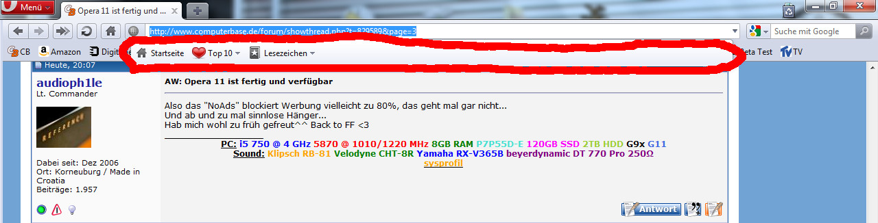 Was mir bei dieser Version aber überhaupt nicht gefällt, ist die neue Adressleiste. Zwar ist es sinnvoll, dass die Domain hervorgehoben wird, allerdings blendet Opera Teile der Addresse aus (z.B. youtube.com/watch statt http://www.youtube.com/watch?v=xrU6JxQ9d2A&feature=fvst) und das geht meiner Meinung nach garnicht.