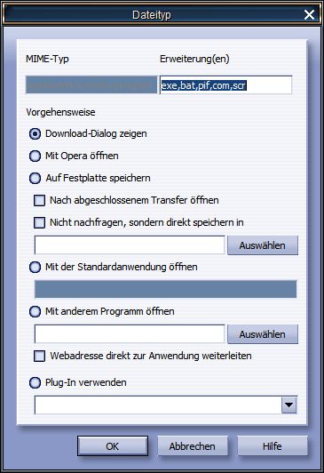 Nun soll man im Browser unter "Extras" - Einstellungen (Alt+P) - Dateitypen anklicken und den Haken