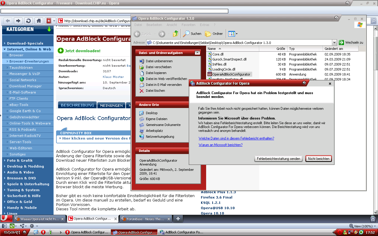Ich will schon seit längerer Zeit den Opera AdBlock Configurator 1.3.0 installieren. Es kommt aber immer nur ne Fehlermeldung wenn die OperaAdBlockConfigurator.exe starten will. Hat da noch jemand Probleme mit oder kann mir sagen wie man das Problem beheben kann?