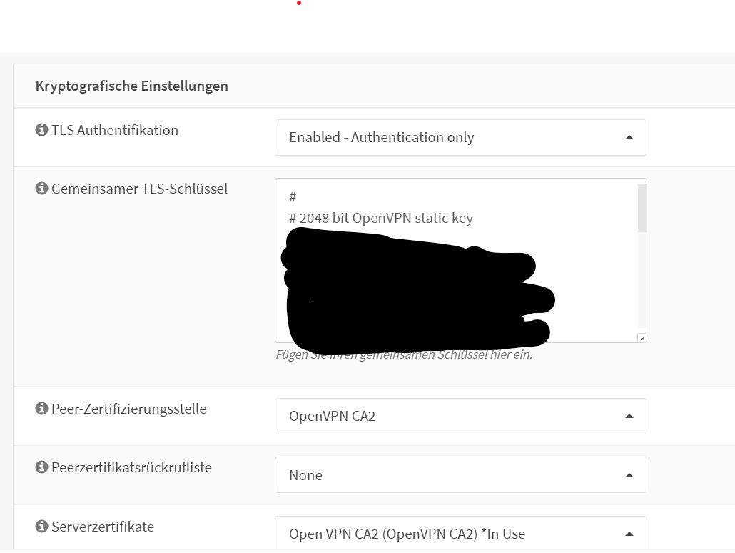 Was ich festgestellt habe, ist dass die Verbindung nur bei ausgeschalteter Opnsense Firewall funktioniert, ansonsten jedoch nicht. Damit kann nach meinem Verständnis eine Fehlkonfiguration des OpenVPN-Servers an sich oder des Client-Zertifikats als auch des NAT-Routers ausgeschlossen werden. Das Problem muss wohl in der Firewall liegen, ich weiß jedoch nicht, wo.