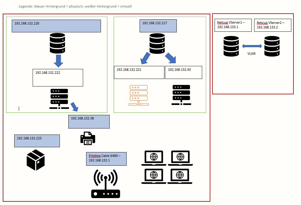 Standort A (zuhause) ist das rote Quadrat links, Standort B das rote Quadrat rechts. An Standort A gibt es eine VM mit opnsense (hinter einer Fritzbox), an Standort B ebenfalls (da ist es aber in einem VLAN bei Netcup).