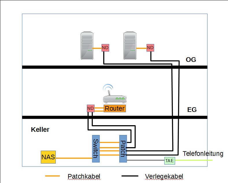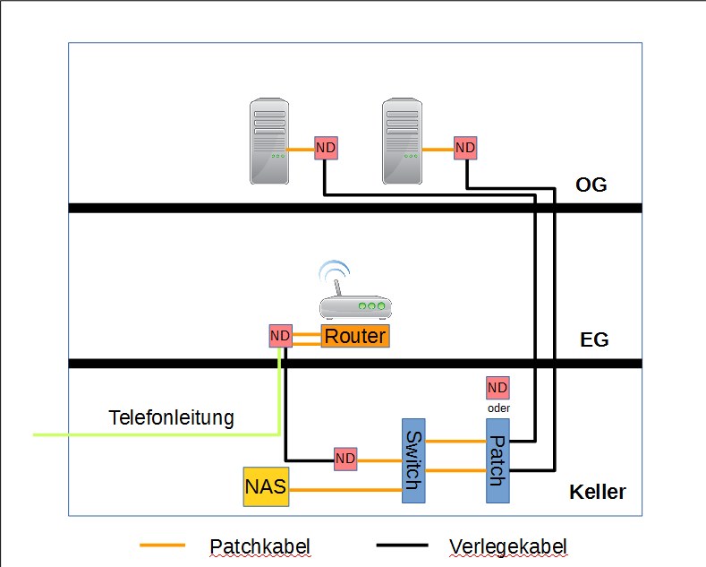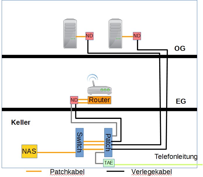 2 PC's im OG sollen über Leerrohre an einem Switch im Keller angebunden werden. Der Switch soll selber an eine Fritzbox 7490 im EG ans Internet (VDSL) angeschlossen werden. Die Telefonleitung geht vom Keller ins EG und von da aus soll wieder ein Kabel zurück in den Keller zum Switch gelegt werden. Am Switch selber würden maximal noch eine NAS oder ein dritter Raum, der sich im Keller befindet, ins Netzwerk eingebunden werden. Daher würde ein 5er-Swich reichen.