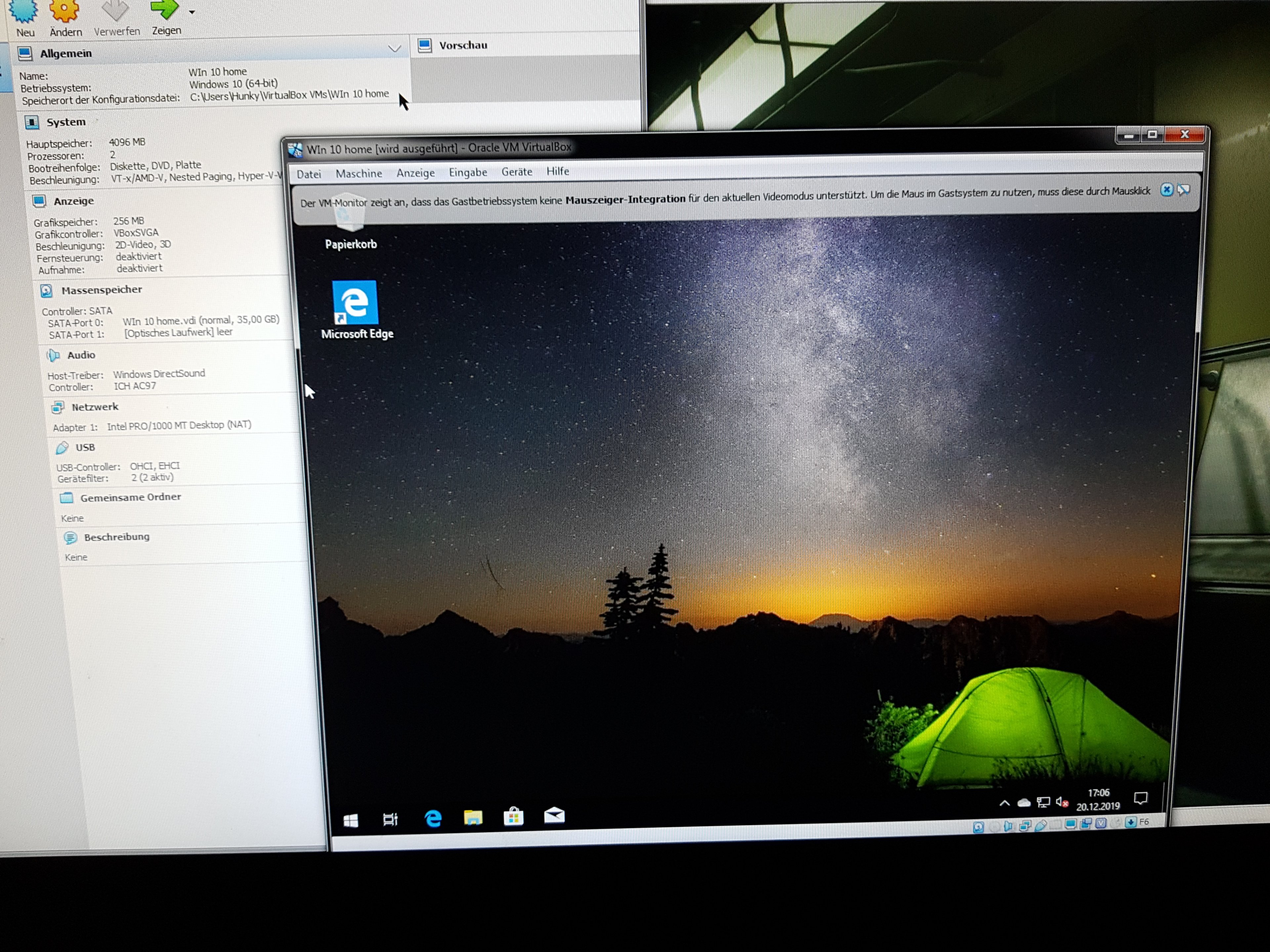 ich nutze auf Windows 7 die Oracle VirtualBox 6.0.14 und so weit klappt auch alles. Allerdings kommt die Maus nicht aus der virtuellen Maschine heraus und ich kann nicht zwischen der Box und dem Hauptdesktop hin- und herschalten. Erst wenn ich Win10 herunterfahre, lässt sich das System wieder normal bedienen. Ich kann auch nicht das Anzeigefenster oben (siehe Screenshot) schließen.