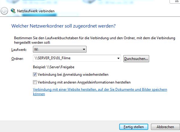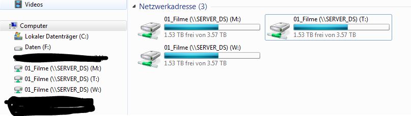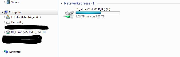 Das selbe passiert beim "Netzlaufwerk verbinden" Button. Da schlägt es mir einen Laufwerksbuchstaben vor "W" und ich gebe noch folgenden ein "\\SERVER_DS\01_Filme" und schwupps erscheint das Laufwerk, ohne Benutzername oder Passwort eingeben zu müssen.