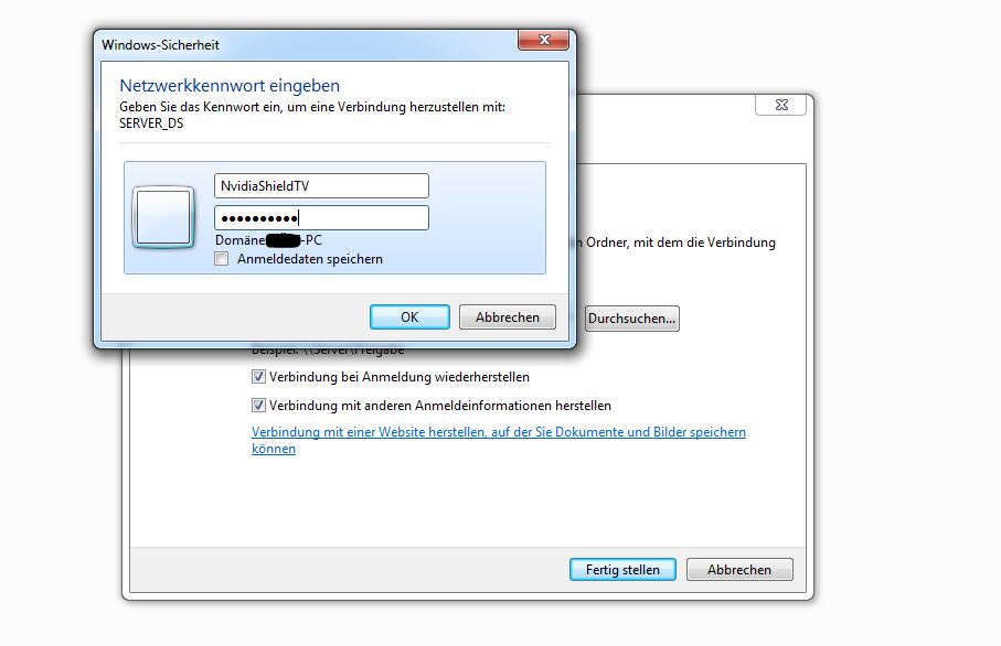 Benutzername und Passwort selbstverständlich gegen den auf der DS angelegten NvidiaShiel… mit dem dazugehörigen Passwort austauschen.Kannst du aber auch ganz normal in dem graphischen Dialog so eingeben, dessen Screenshot du in 27 gepostet hast (zweiter, 3.JPG) – dort aber das Häkchen vor „Verbindung mit anderen Anmeldeinformationen herstellen“ setzen.
