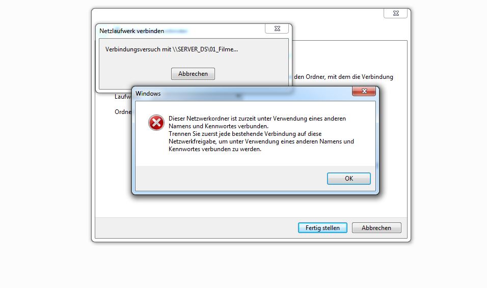„Dieser Netzwerkordner ist zurzeit unter Verwendung eines anderen Namens und Kennwortes verbunden. Trennen Sie zuerst jede bestehende Verbindung auf diese Netzwerkfreigabe, um unter Verwendung eines anderen Namens und Kennworts verbunden zu werden.“