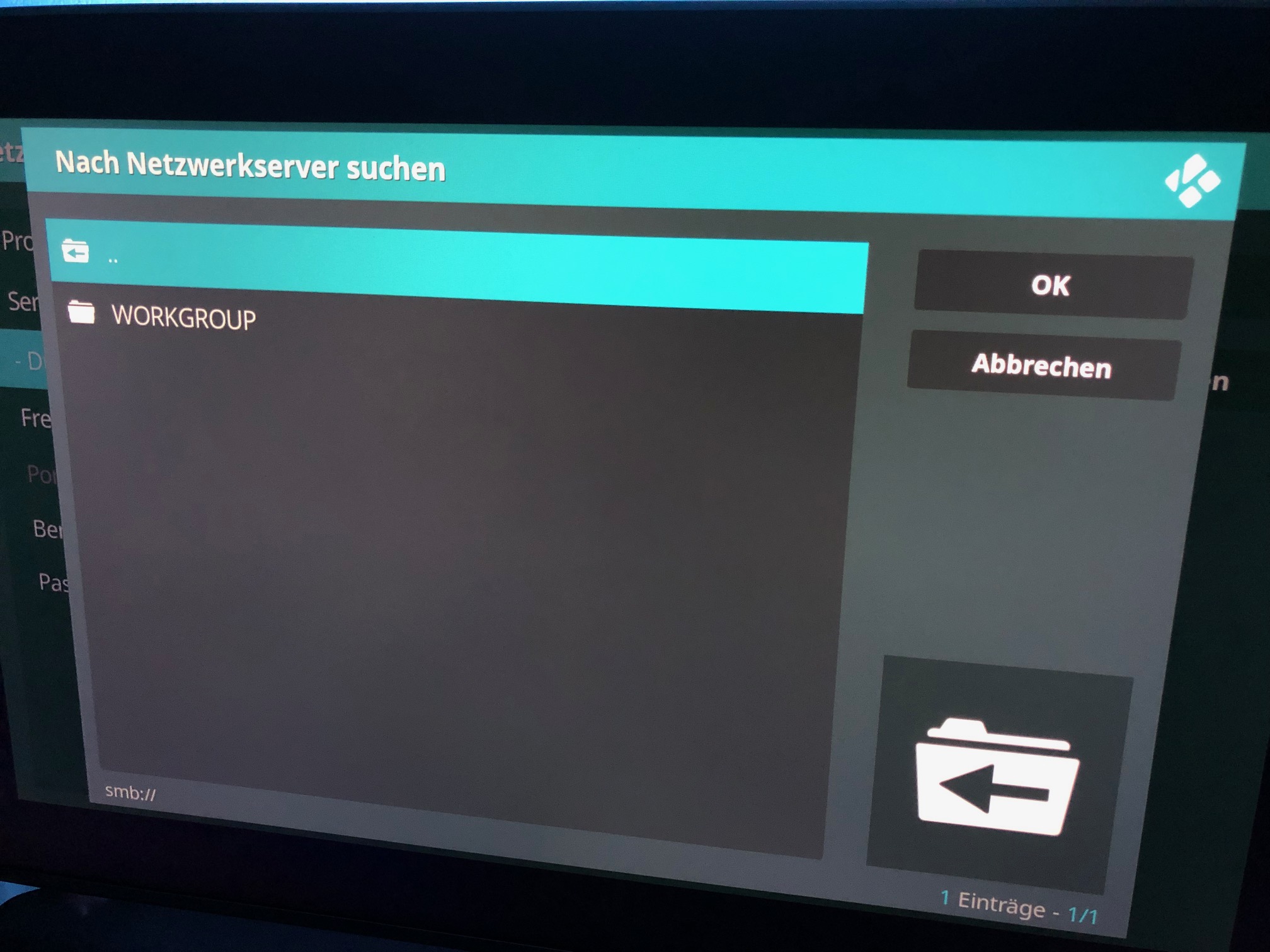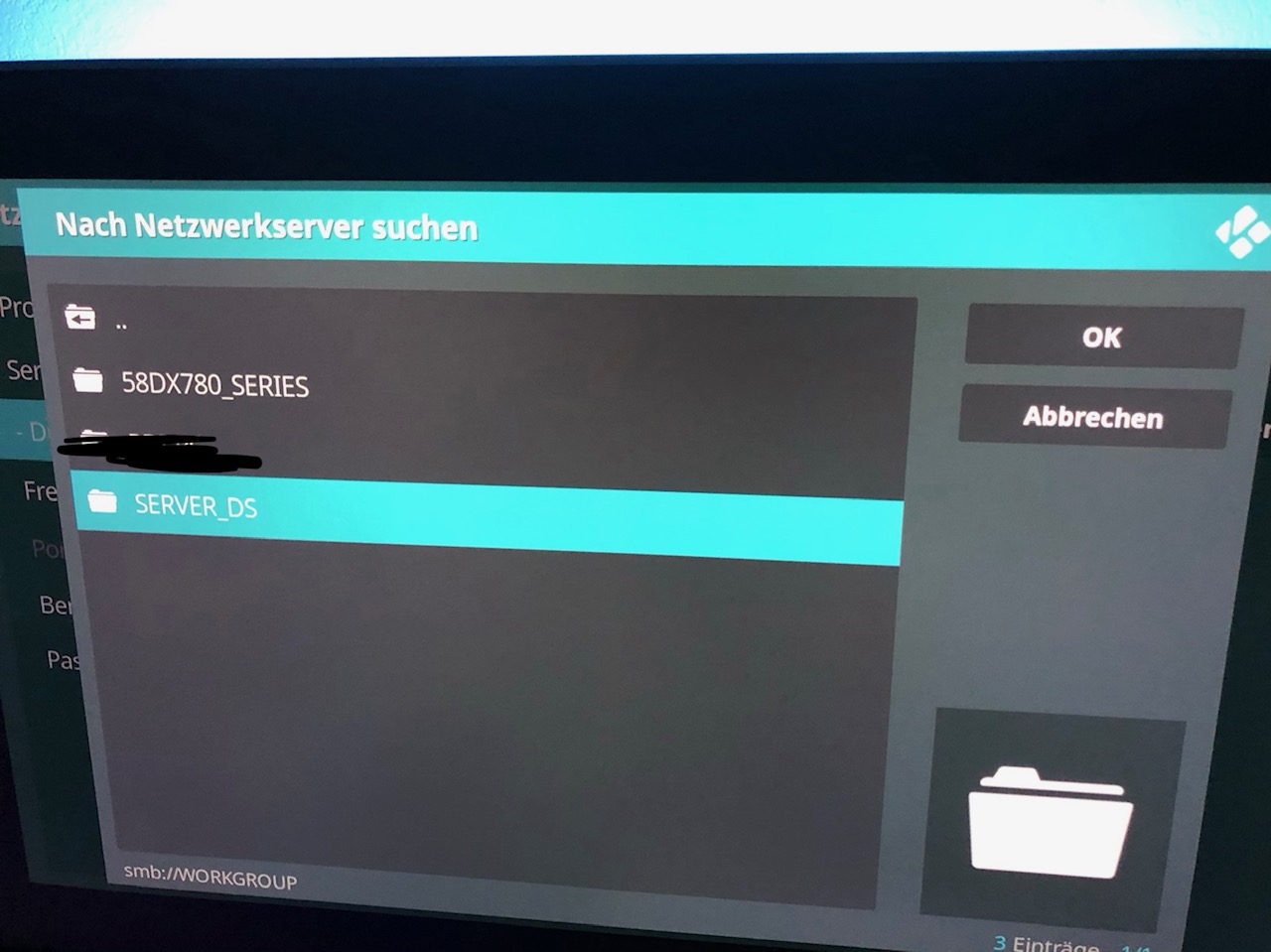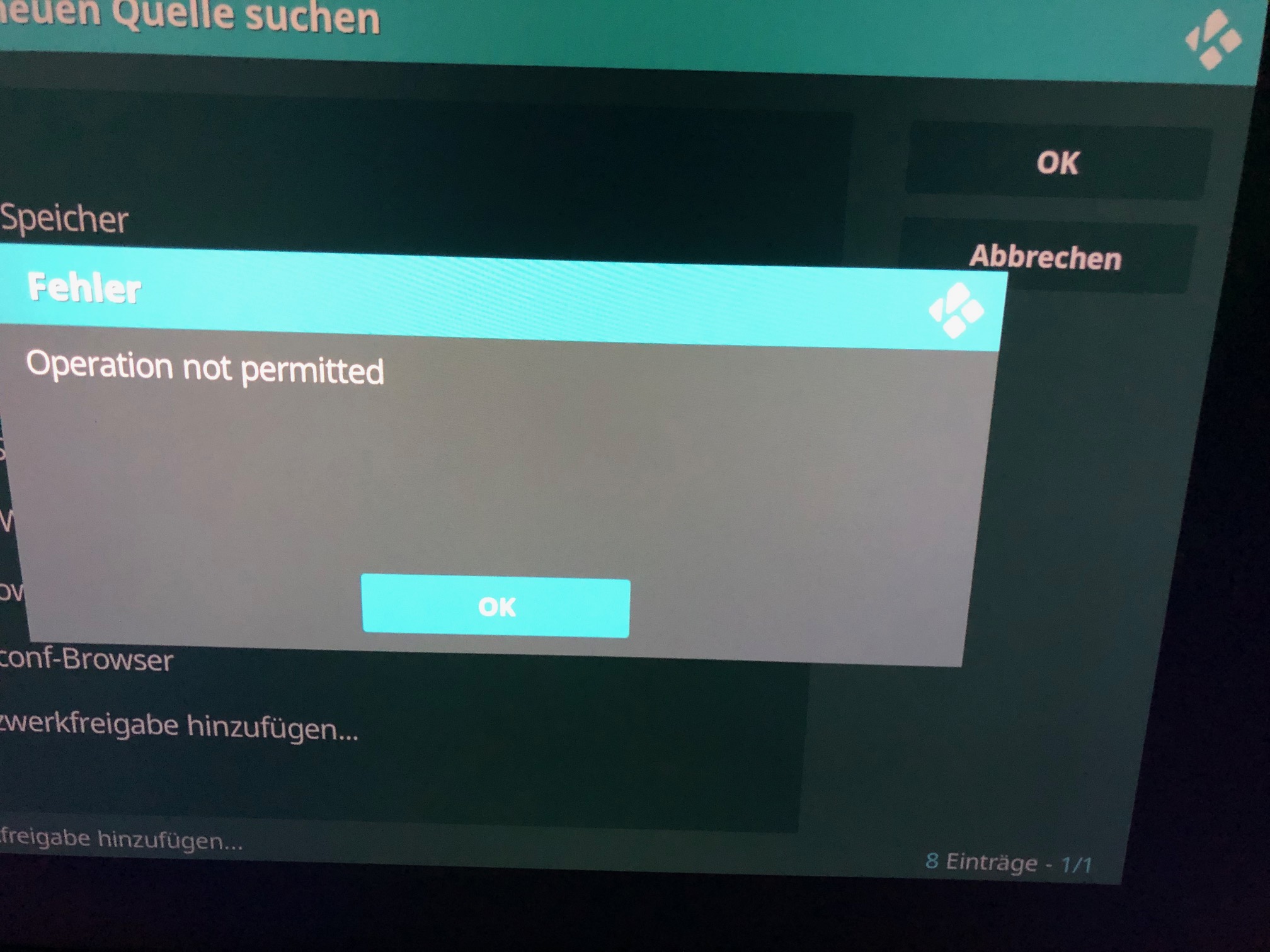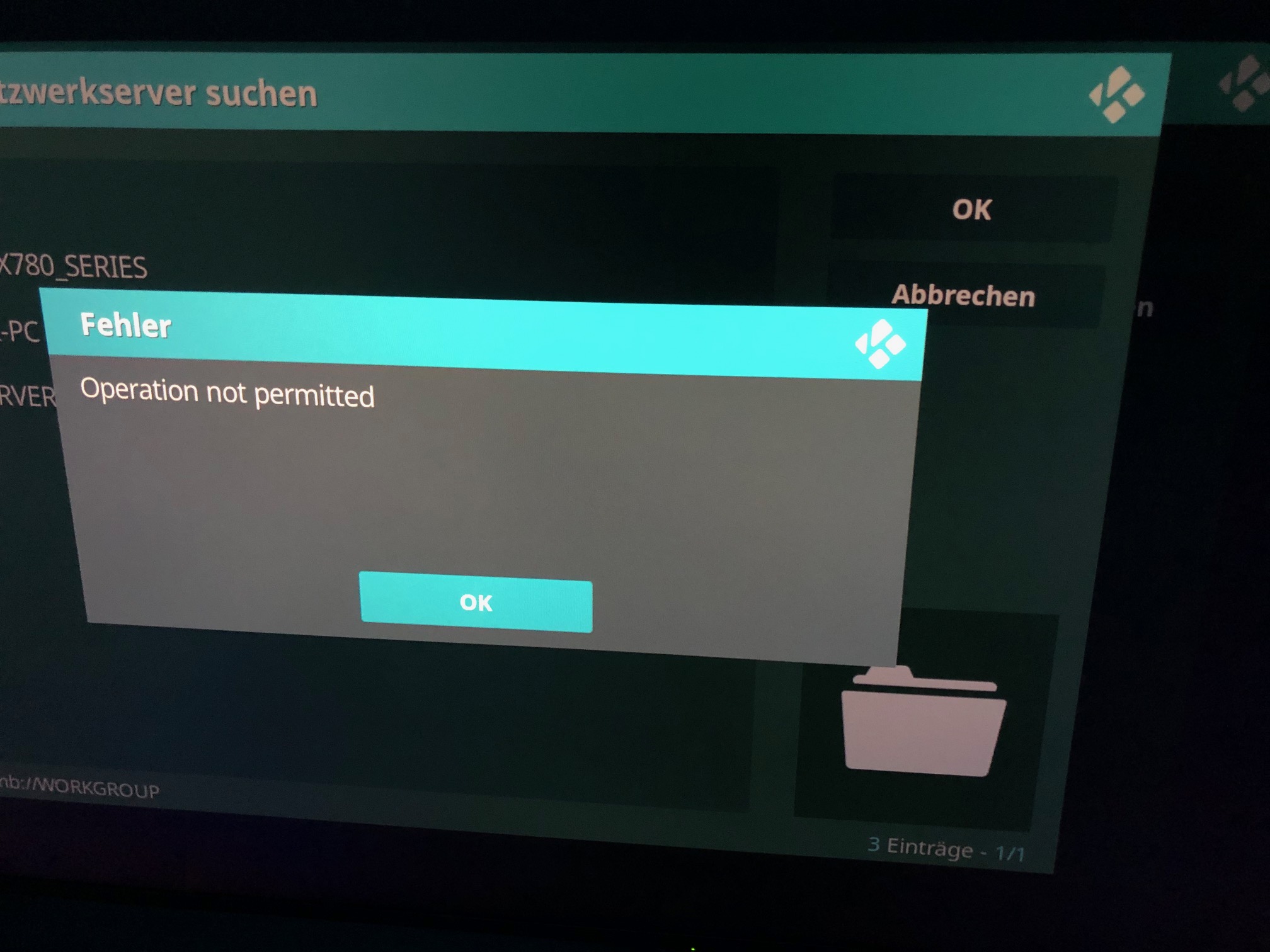 Ich gehe auf Netzwerkfreigabe hinzufügen, dann direkt auf Durchsuchen. Dabei geht ein Fenster auf, darin ist der Ordner Workgroup, ich klicke drauf, mein TV und PC erscheint + SERVER_DS, ick klicke auf SERVER_DS, das Ergebnis "Operation not permitted"