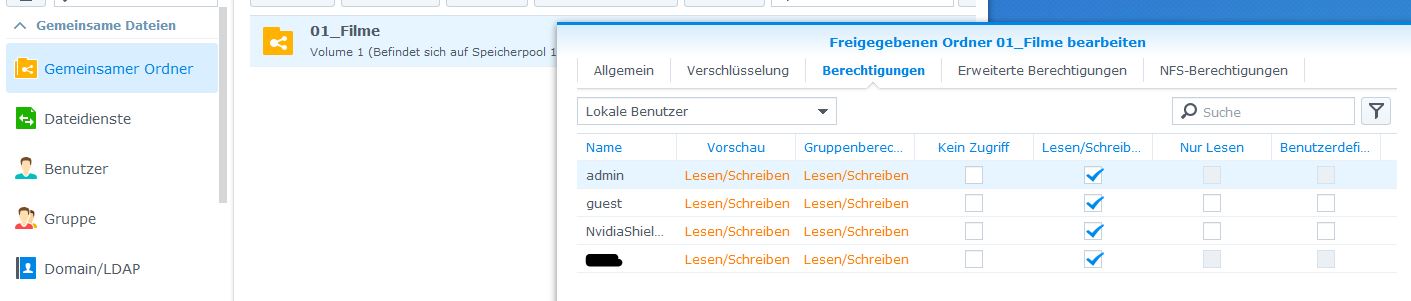 guest mitsamt seinen Berechtigungen verwendet wird. Probier mal, auf der Shield mit diesem Benutzer guest und leerem Passwort auf den freigegebenen Ordner zuzugreifen. Funktioniert das nicht, bitte https://originwww.synology.com/de-de/knowledgebase/DSM/help/DSM/AdminCenter/file_share_privilege lesen und einen Screenshot vonSynology-Weboberfläche → Systemsteuerung → Gemeinsamer Ordner → (Ordner markieren, um den es geht) → bearbeiten → Reiter Berechtigungen