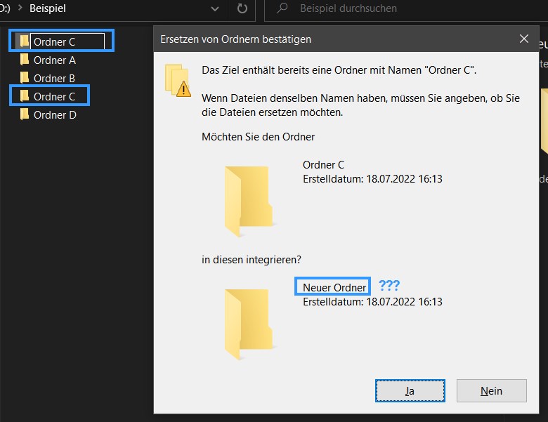 In meinem Beispiel (siehe Screenshot) möchte ich einen "Ordner C" erstellen, der (wie man sieht) bereits vorhanden ist. Wenn ich jetzt mit "Ja" antworte, ändert sich rein gar nichts. Es entsteht auch kein "Neuer Ordner", in den dieser "Ordner C" laut Dialogfrage integriert wird. Also was soll das Ganze?