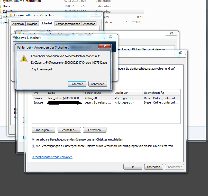 So weit so gut. Nun kommen in die Unterordner die User nicht rein und es ist bei der Sicherheit da auch noch gar nix eingestellt... und ich muss für diese Unterordner und deren Unterordner alles genauso einstellen..... Bei den Dateien dann genauso..... Dateien, die neu erzeugt und gespeichert werden, haben dann aber die Einstellunegn vom Ordner, nur die alten halt leider nicht....