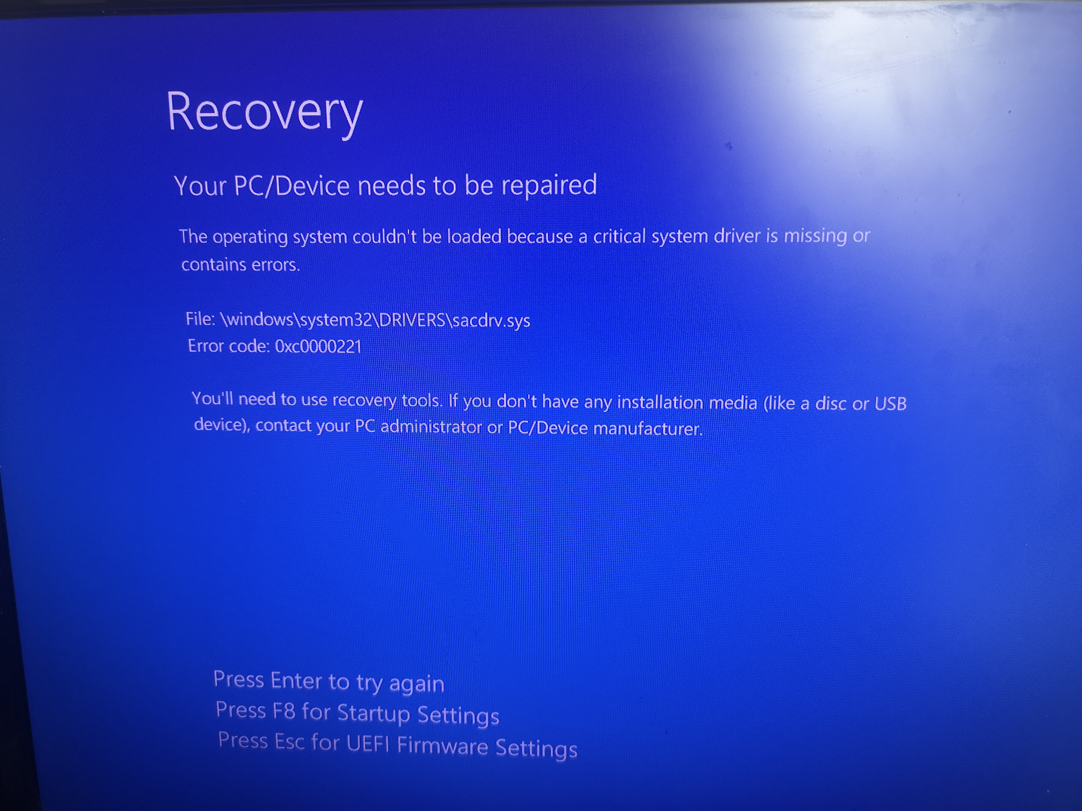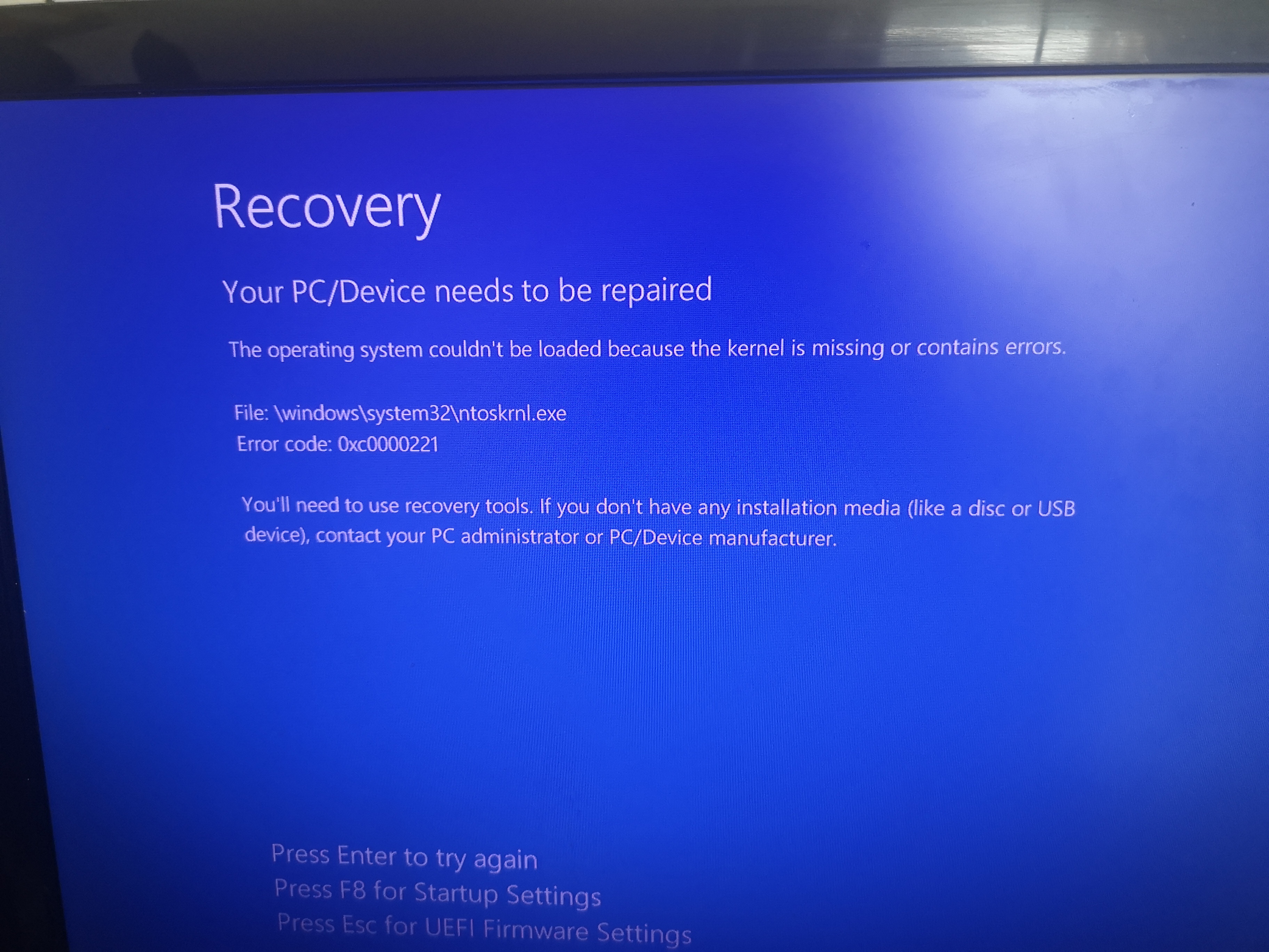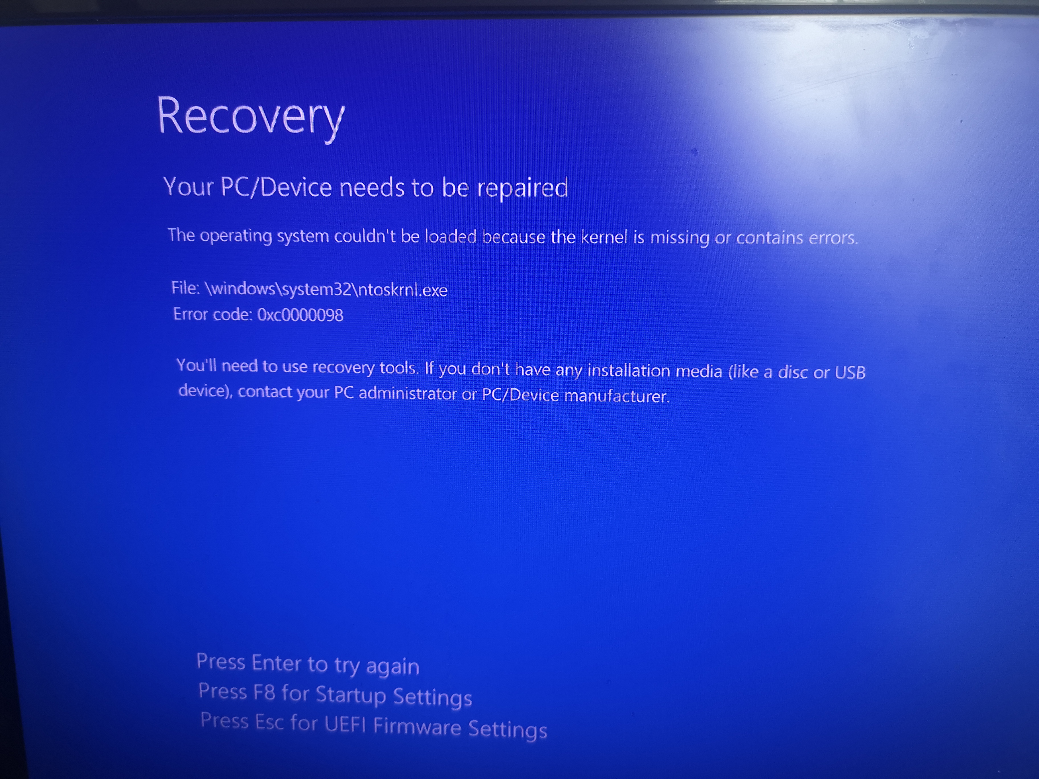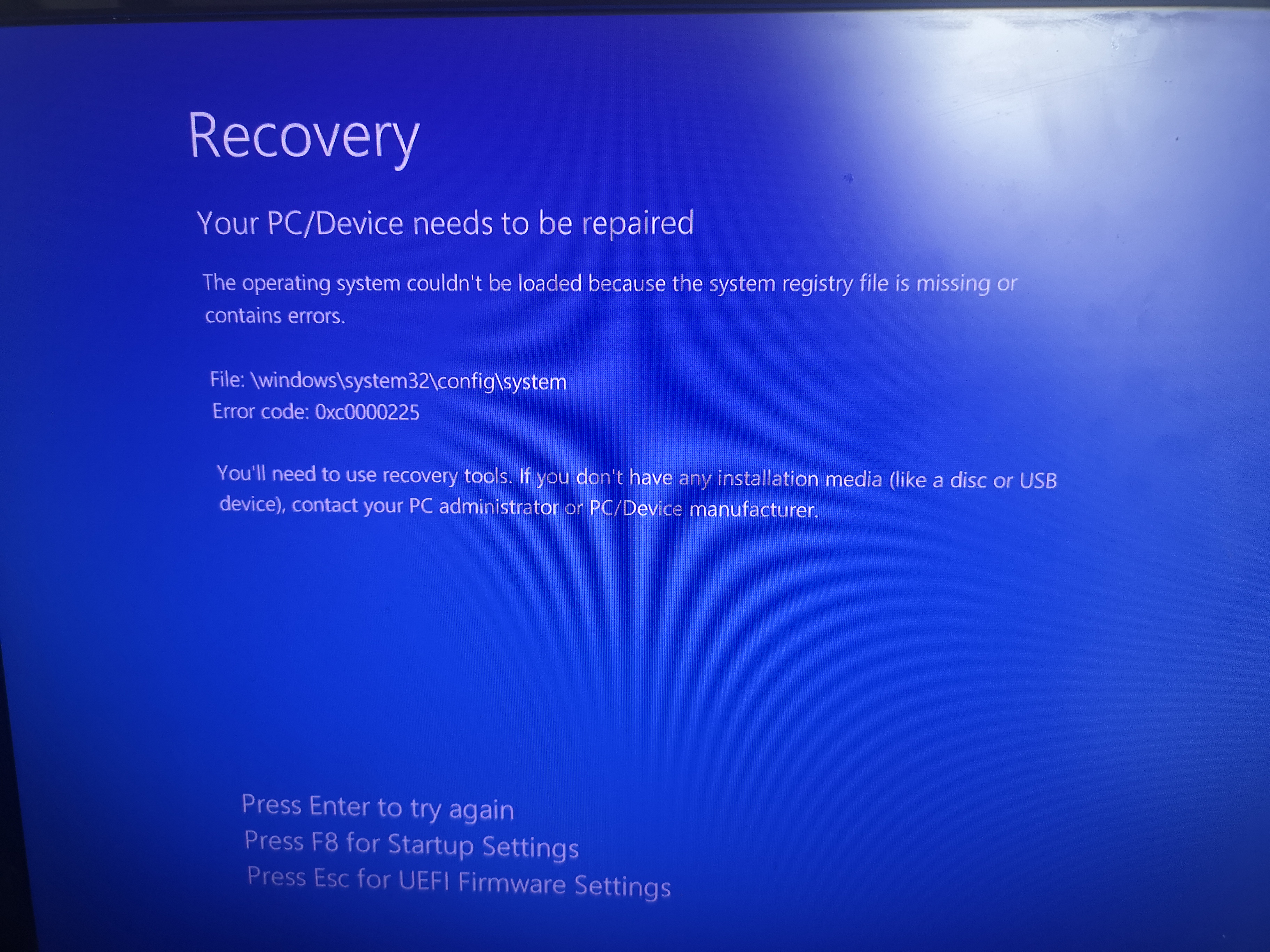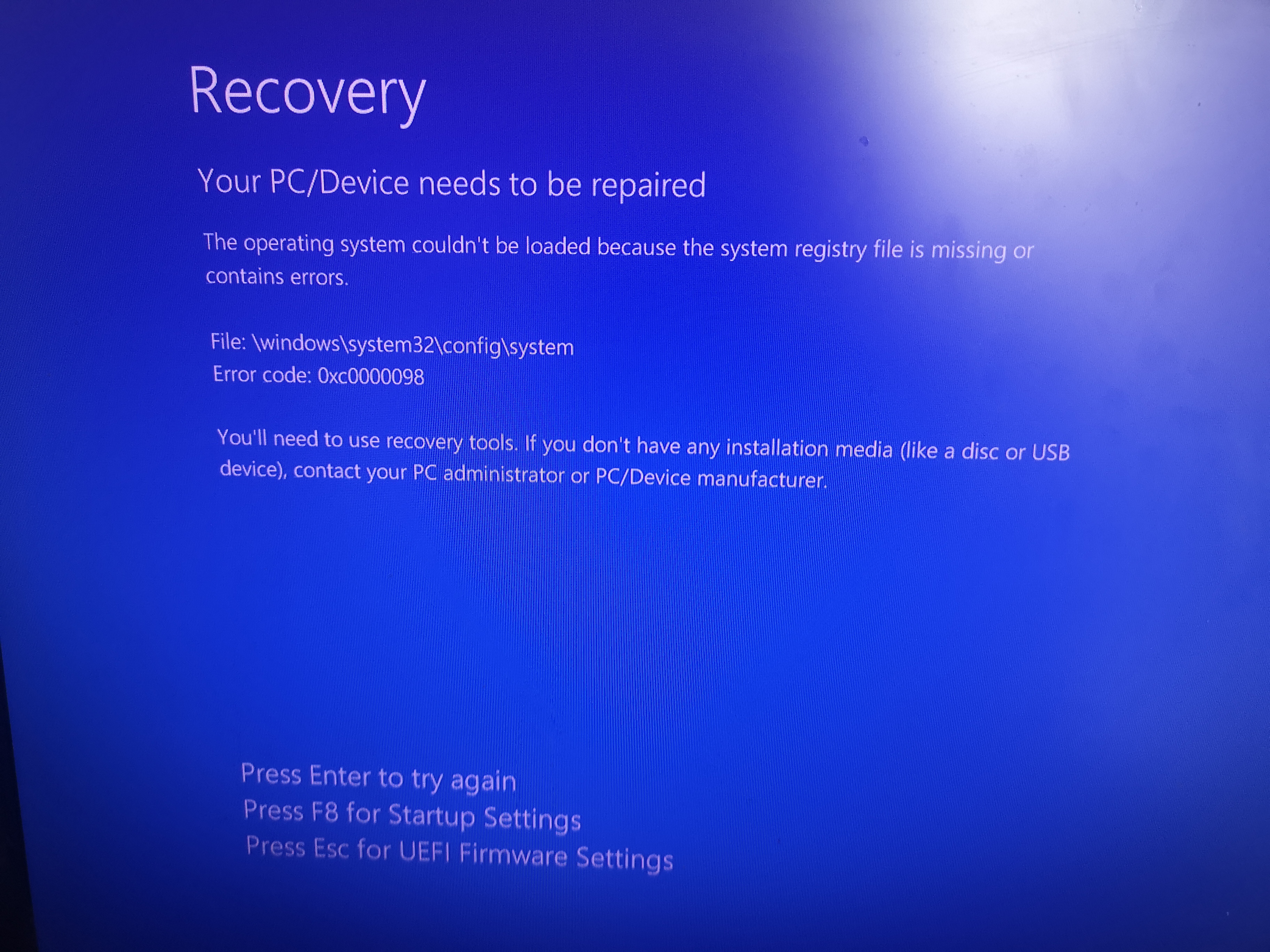 Meistens wird stattdessen der Wiederherstellungs-Screen mit "Ihr PC muss repariert werden" (immer mit anderen Fehlern oder anderen fehlenden oder defekten Dateien) angezeigt. F8 pressen bringt nix: dann läd der Screen nur neu mit anderen Fehlermeldungen. Wenn ich F1 drücke (Reperatur) startet der PC neu, landet aber nur extrem selten auf den Reperaturoptionen. In den meisten Fällen kommt nur erneut der Wiederherstellungs-Screen, teilweise bleibt es im Bios-Ladescreen hängen, und zeitweise kriege ich einen BSOD.