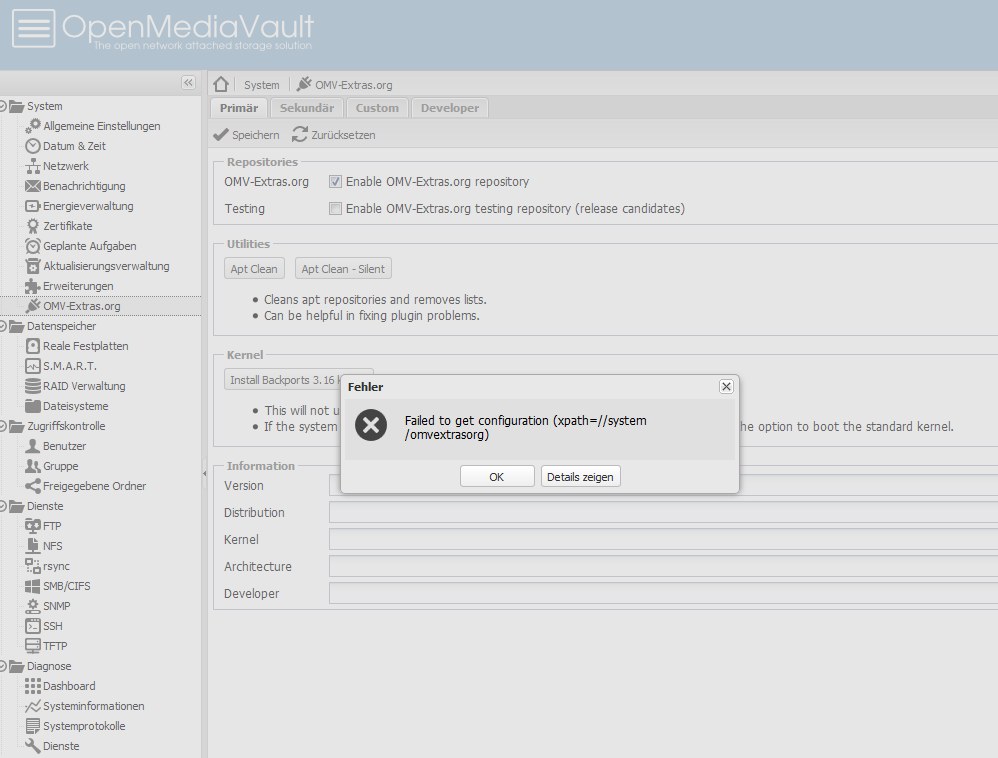Also habe nun omv extras installiert jedes mal wenn ich auf die optionen gehe kommt nun diese meldung: