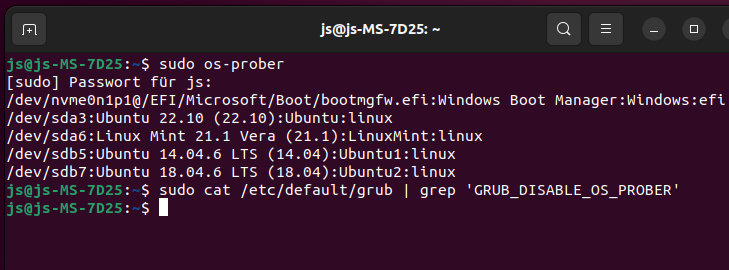 Nun bin ich mir aber nicht mehr sicher, ob ich den Befehl zum grub-update aus 22.04 oder 21.1 ausgeführt habe. Spielt das Thema noch eine Rolle oder hat sich das irgendwie erledigt? Sollte im Zweifel dann doch eher aus Mint 21.1 grub-update durchführen?