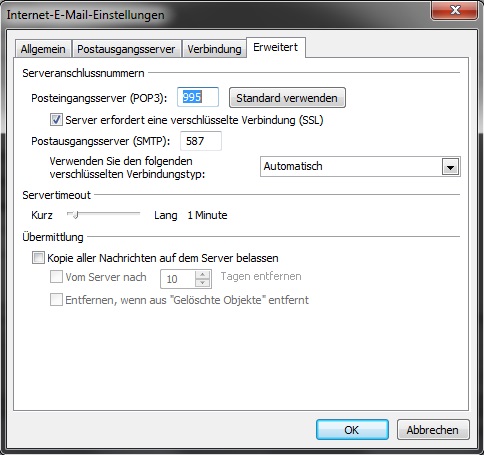 Sollten Sie bei E-Mail-Adressen unter outlook.de Probleme haben, versuchen Sie bitte das .com in den Server-Adressen durch .de zu ersetzen.
