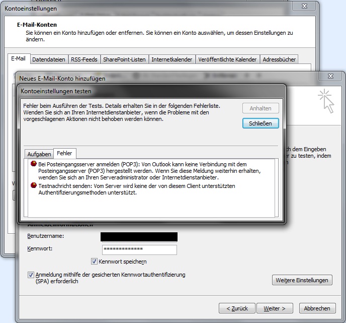Habe nach jeder änderung in der Konfiguration auf "Kontoeinstellungen Testen" geklickt. Und immer wieder ist dieser Negativ ausgefallen ;-(