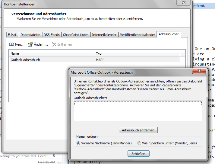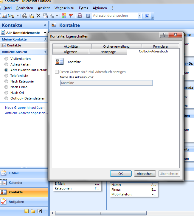 Das Problem ist das ich in den Eigenschaften meines Kontakte-Ordners nicht auswählen kann das ich diesen Ordner als Adressbuch nutzen will. Zusätzlich kann ich das vorhande Adressbuch (welches leer ist) nicht entfernen, da es wohl immer existieren muss. Weiterhin kann ich auch kein neues Adressbuch hinzufügen (ausser LDAP oder eins für Mobilfunktelefone was mir auch nicht weiterhilft) da es nur ein Outlookadressbuch MAPI geben darf.