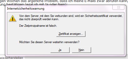 Jetzt hoffe ich halt auf eure Kompetenzen. Habt ihr irgendeine Idee, wie ich den Fehler wegbekomme? Das Abrufen der Mails klappt ja interessanter Weise trotzdem.