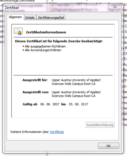 Jedenfalls habe ich auch schon probiert, das Zertifikat, welches mir der Provider auch nochmals geschickt hat, aus der Microsoft Management Console (MMC) zu löschen und dort neu einzufügen. Hat ebenfalls nix gebracht.