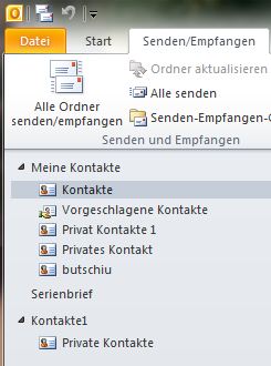->Ich habe in meinem Outlook 2010 Client die Standard Kontaktordnergruppe ''Kontakte'' mit Unterordnern und eine eigene angelegte Ordnergruppe die ''Kontakte1'' heißt.