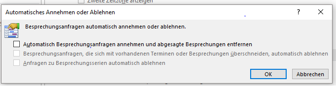 In den Einstellungen "Automatisches Annehmen oder Ablehnen" sind keinen Haken gesetzt (siehe Anhang)